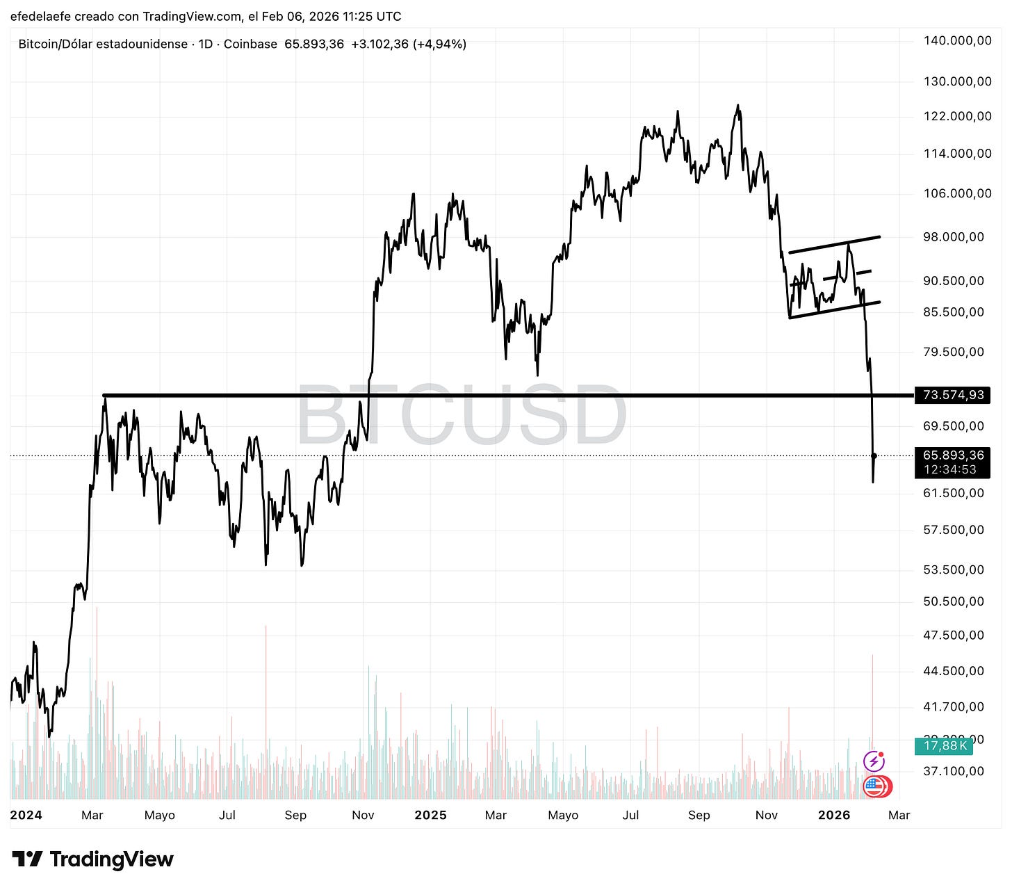 Tiene todas las características de una capitulación de venta. Cuando el volumen se dispara a niveles extremos durante una caída vertical, suele significar que “el último vendedor ha vendido”. Es pánico puro.