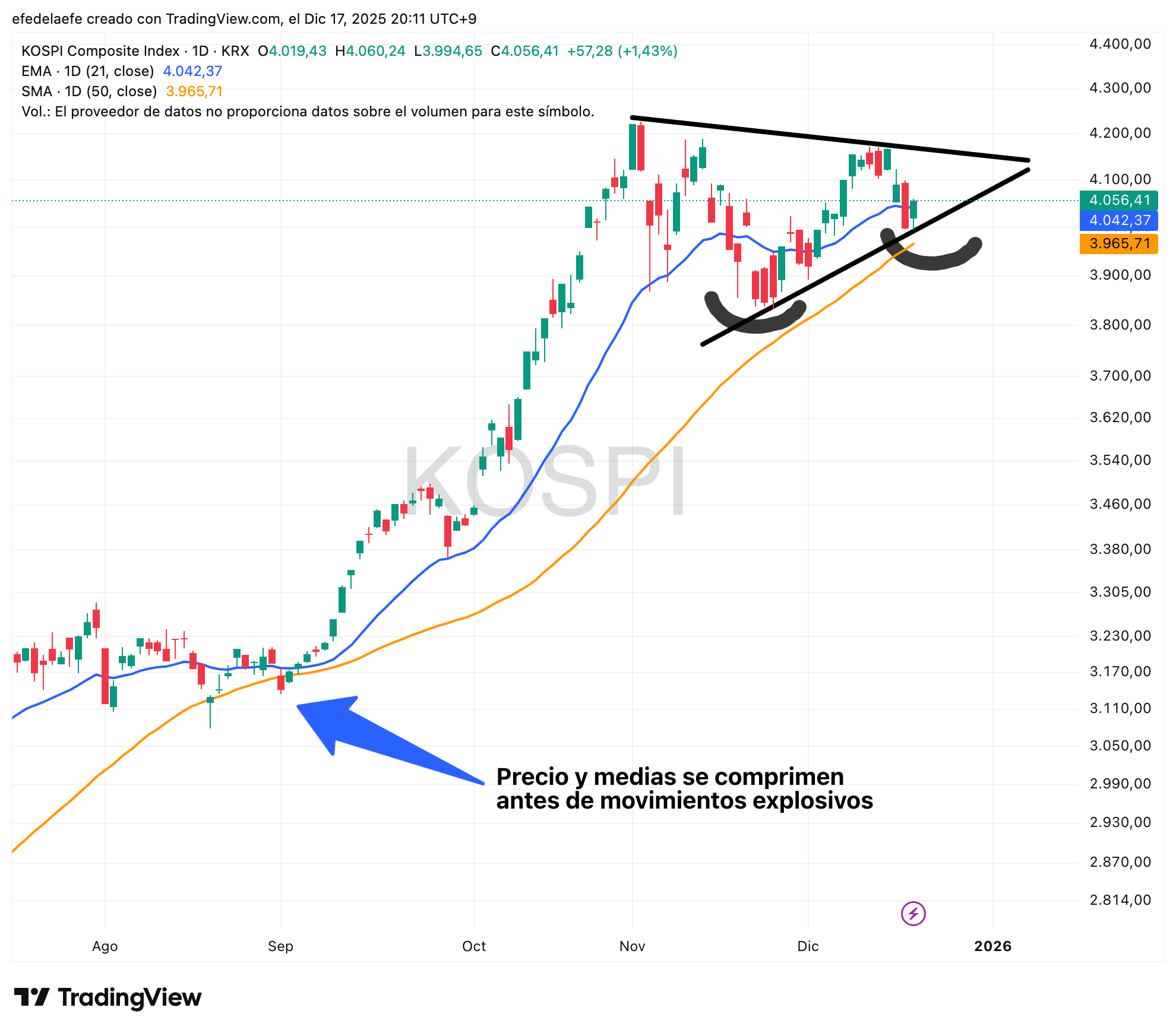 La Compresión: Mira cómo el precio está “apretado” entre la línea negra superior (que baja) y la línea naranja (SMA 50) que sube. Se está quedando sin espacio.