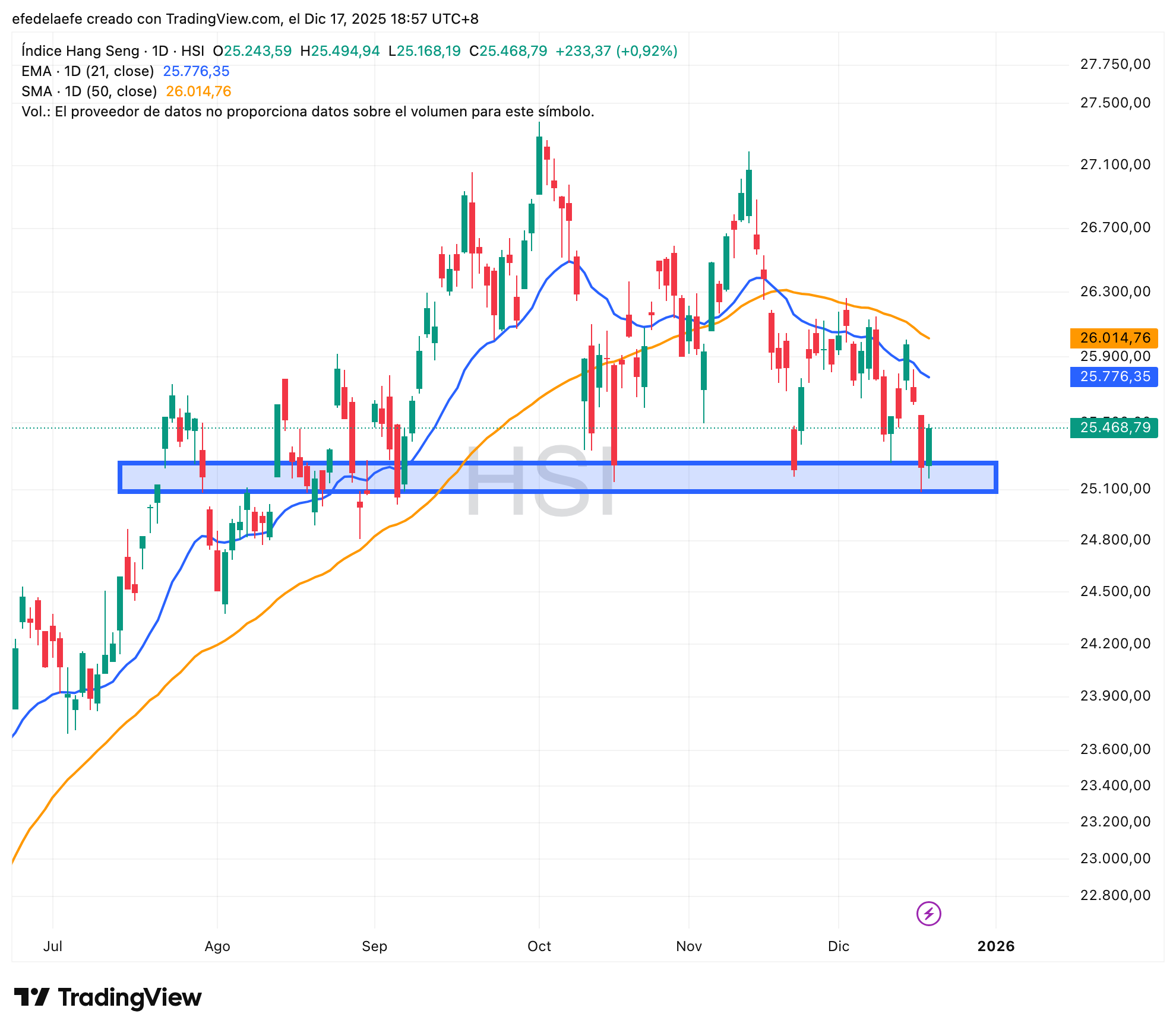 El índice está descansando justo sobre el soporte de los 25.100 - 25.400 puntos. Es el “último bastión”; si pierde esa caja azul al cierre, no tiene suelo técnico cercano y la caída podría acelerarse.