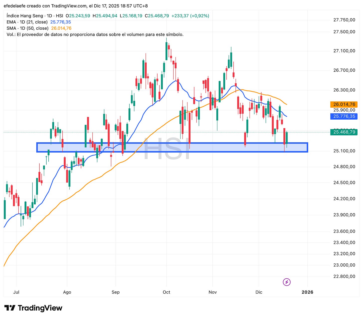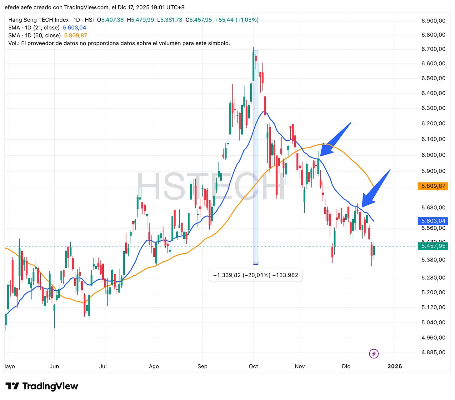 Técnicamente, una caída del 20% desde el pico suele ser la definición de libro de entrar en “territorio bajista” (Bear Market). El gráfico del Hang Seng TECH es, con diferencia, el más feo de los tres que hemos visto. 🔴