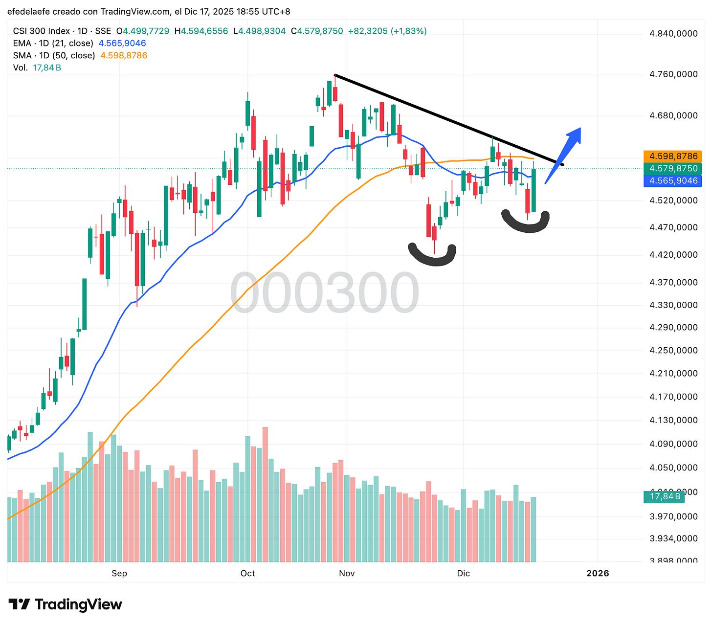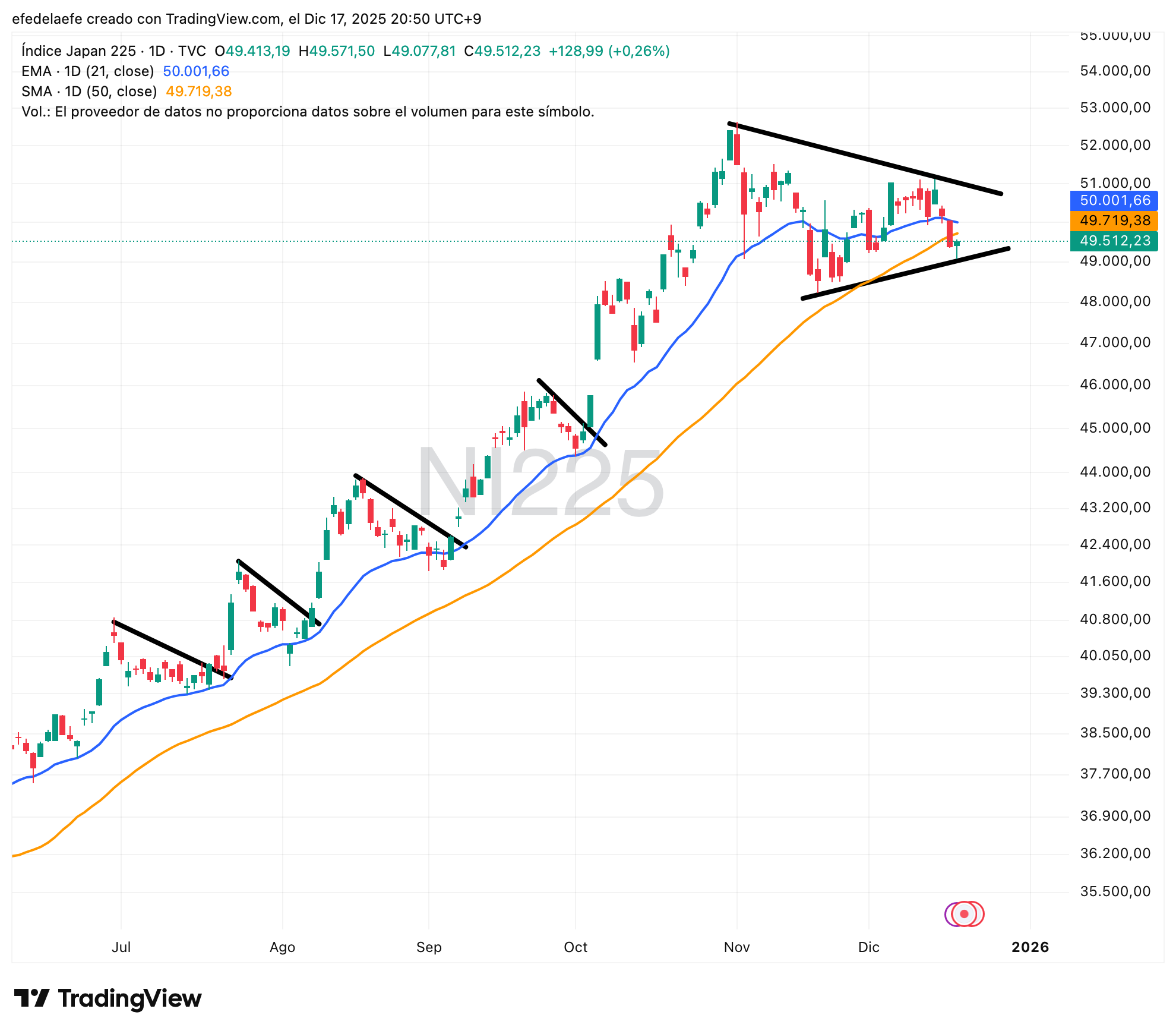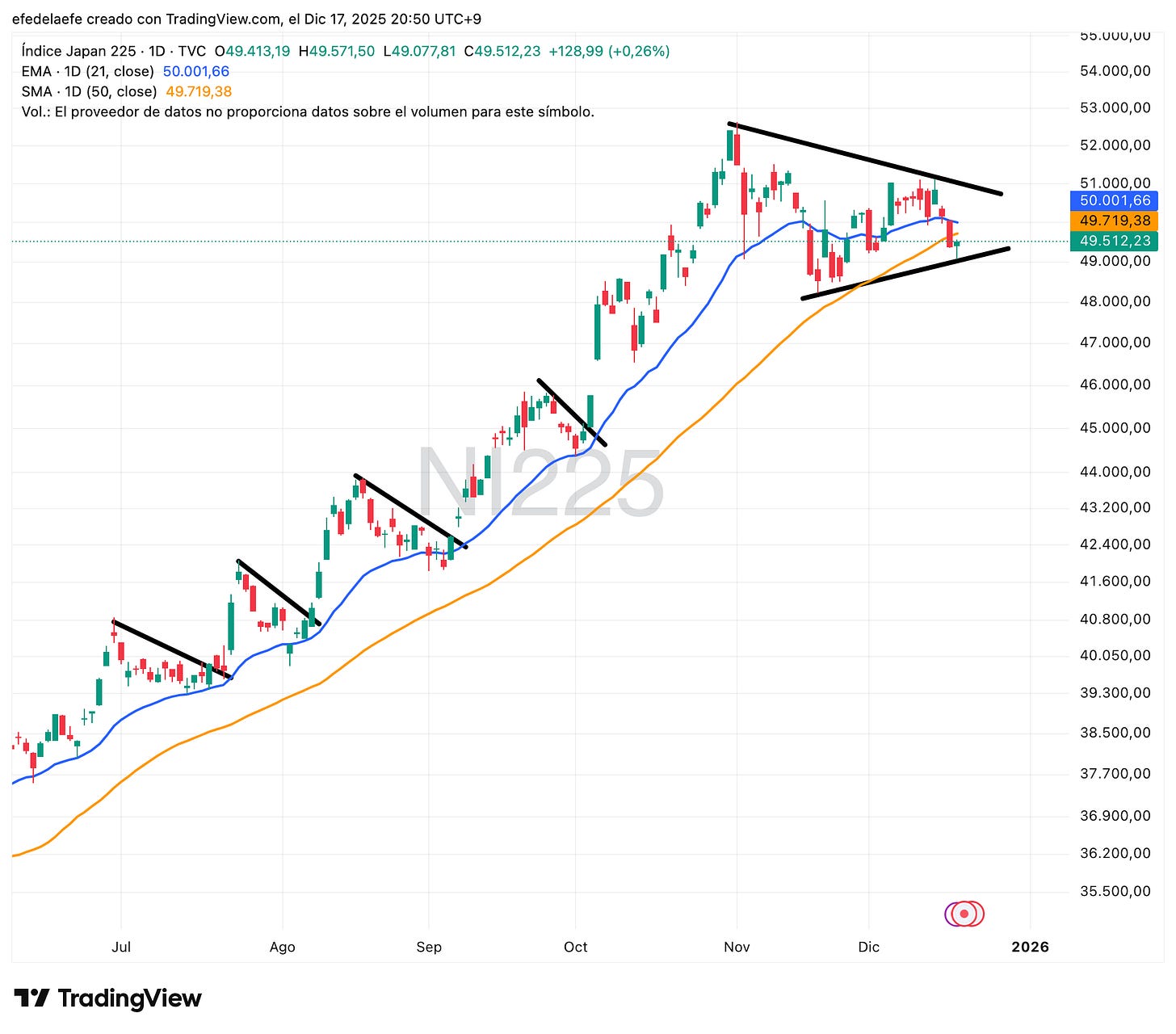 A diferencia del CSI 300 que peleaba con las medias, aquí el precio ya las ha perdido totalmente. Lo peor es el cruce: fíjate cómo la línea azul (EMA 21) ha cruzado hacia abajo a la línea naranja (SMA 50) alrededor de los 26.000 puntos. Esa es una señal de venta clásica a medio plazo. 🟡