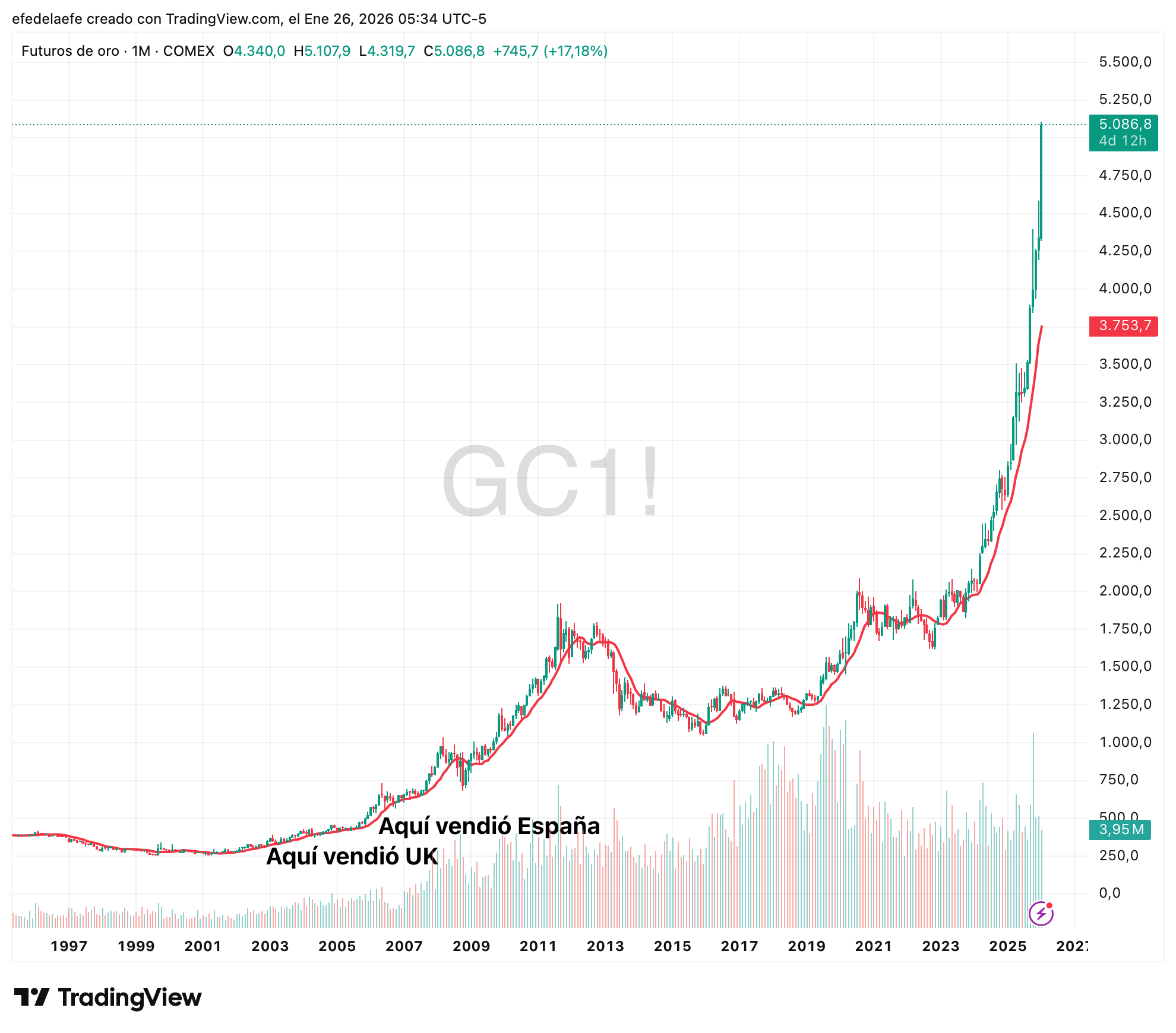 El caso más famoso es Reino Unido, que liquidó una parte enorme de reservas justo cerca de mínimos (“Brown’s Bottom”) en torno a $275, pero España también lo vendió en 2007 en torno a $500 (Zapatero-Solbes).