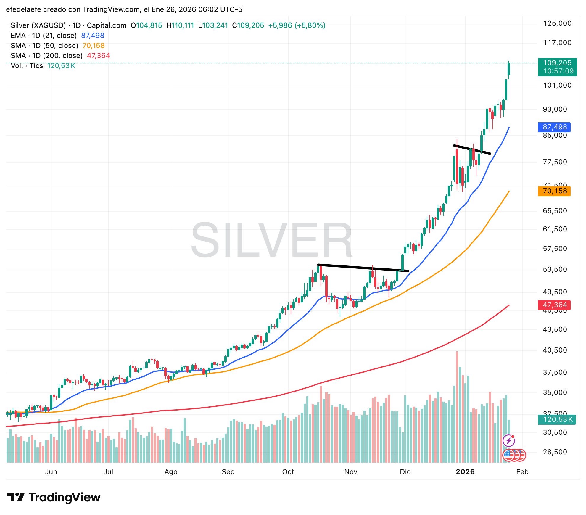 El cobre está en una fase de re-acumulación. No hay pánico comprador (como en la plata), sino una subida sostenida. Por encima de la media de 21 días (línea azul) parece preparado para hacer nuevos máximos.