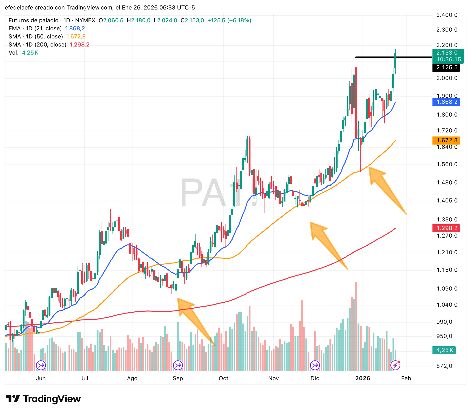 A medio camino entre el cobre y la plata está el paladio. El paladio es un metal industrial (usado casi exclusivamente en catalizadores de coches de gasolina/híbridos), pero cotiza con la volatilidad de un metal precioso. Tiene menos liquidez que el oro o la plata. Eso significa que los movimientos son bruscos.