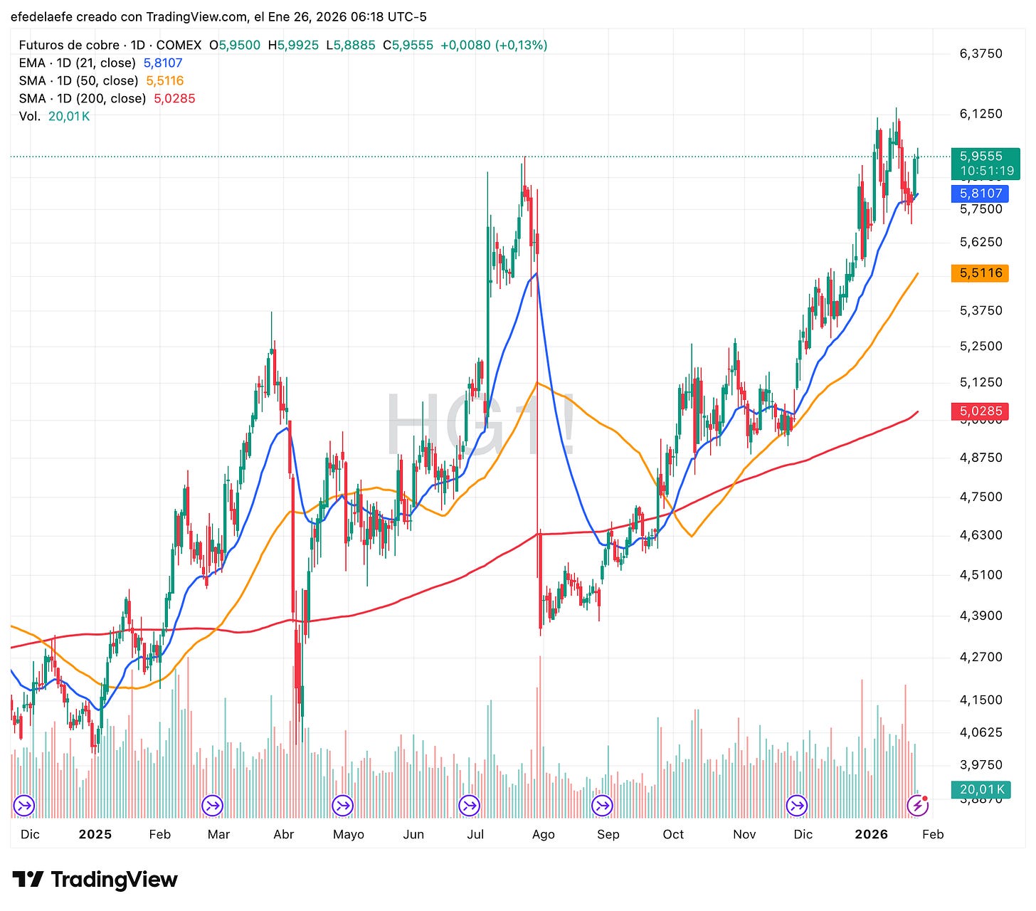 Mientras la plata está en euforia, el cobre muestra una tendencia alcista estructurada y volátil. Esa volatilidad, los movimientos fuertes de abril y julio son causados por la incertidumbre política: como hemos visto antes el cobre está sujeto a aranceles.