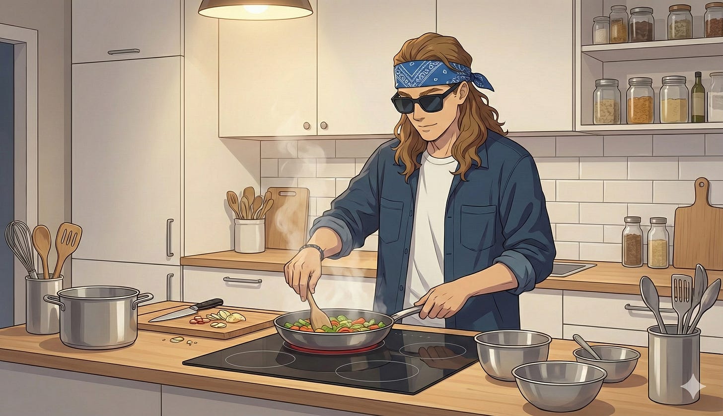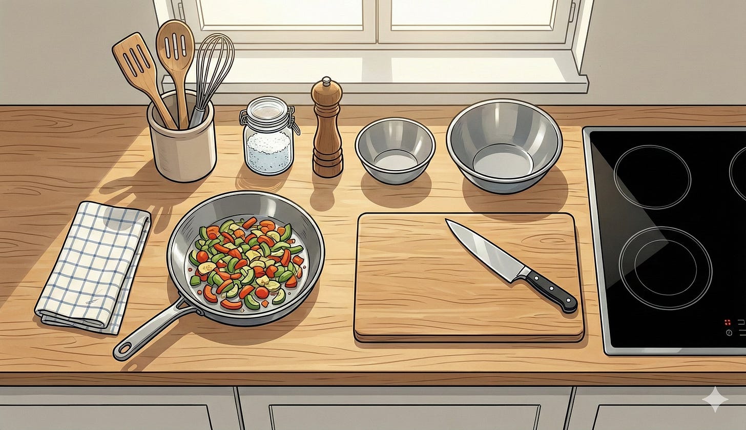 Lo que tienes ahora mismo encima: el cuchillo, los tomates, la tabla. Todo lo que estás usando en este instante para que la receta salga. Si algo no está en la mesa, no lo usas rápido.