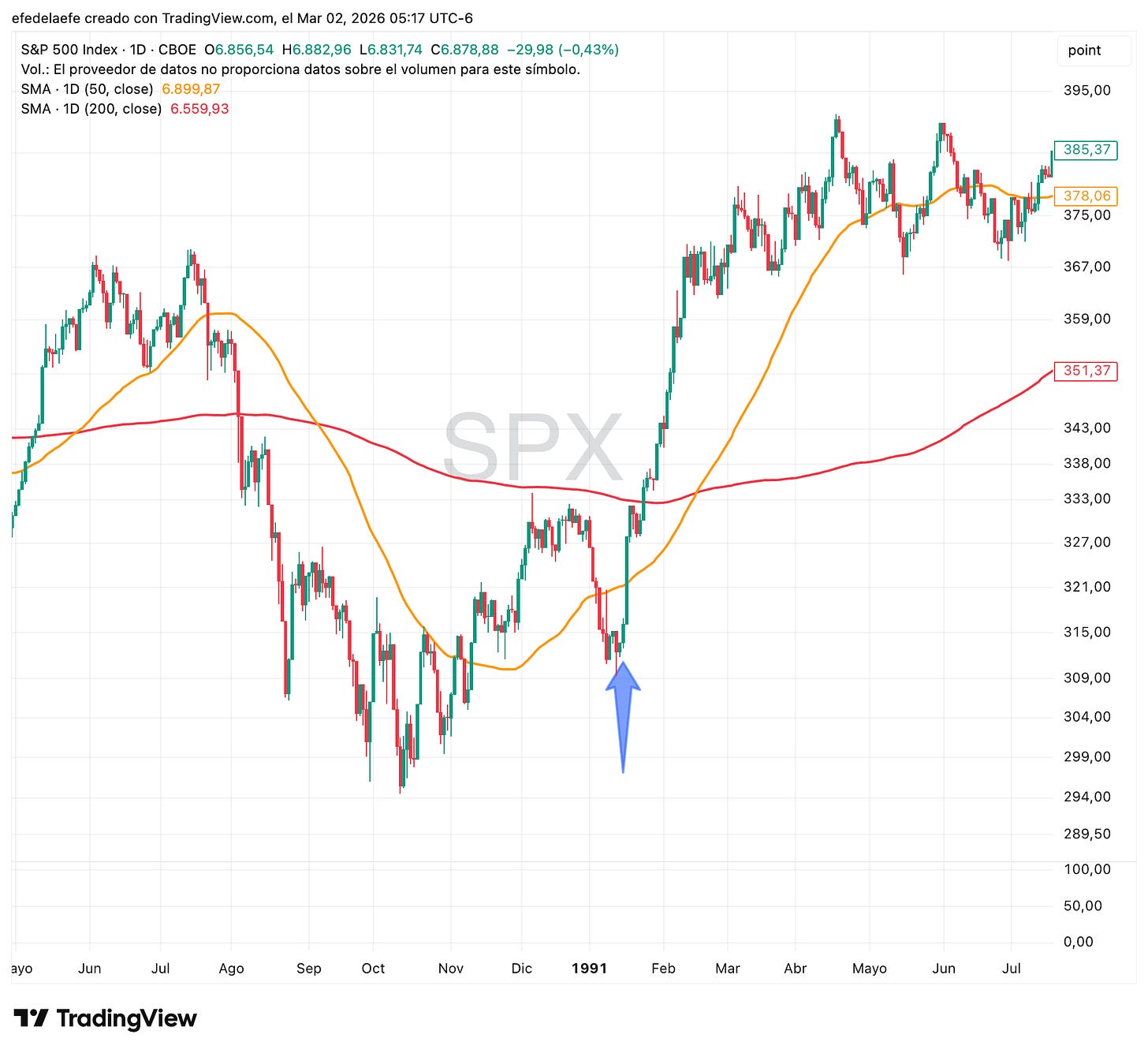 El ejemplo más ilustrativo es el de enero de 1991. El S&P 500 llevaba meses cayendo mientras el mundo esperaba si habría guerra en el Golfo. El 17 de enero, cuando comenzaron los bombardeos de la Operación Tormenta del Desierto, el mercado tocó suelo y arrancó una de las subidas más limpias de la década.