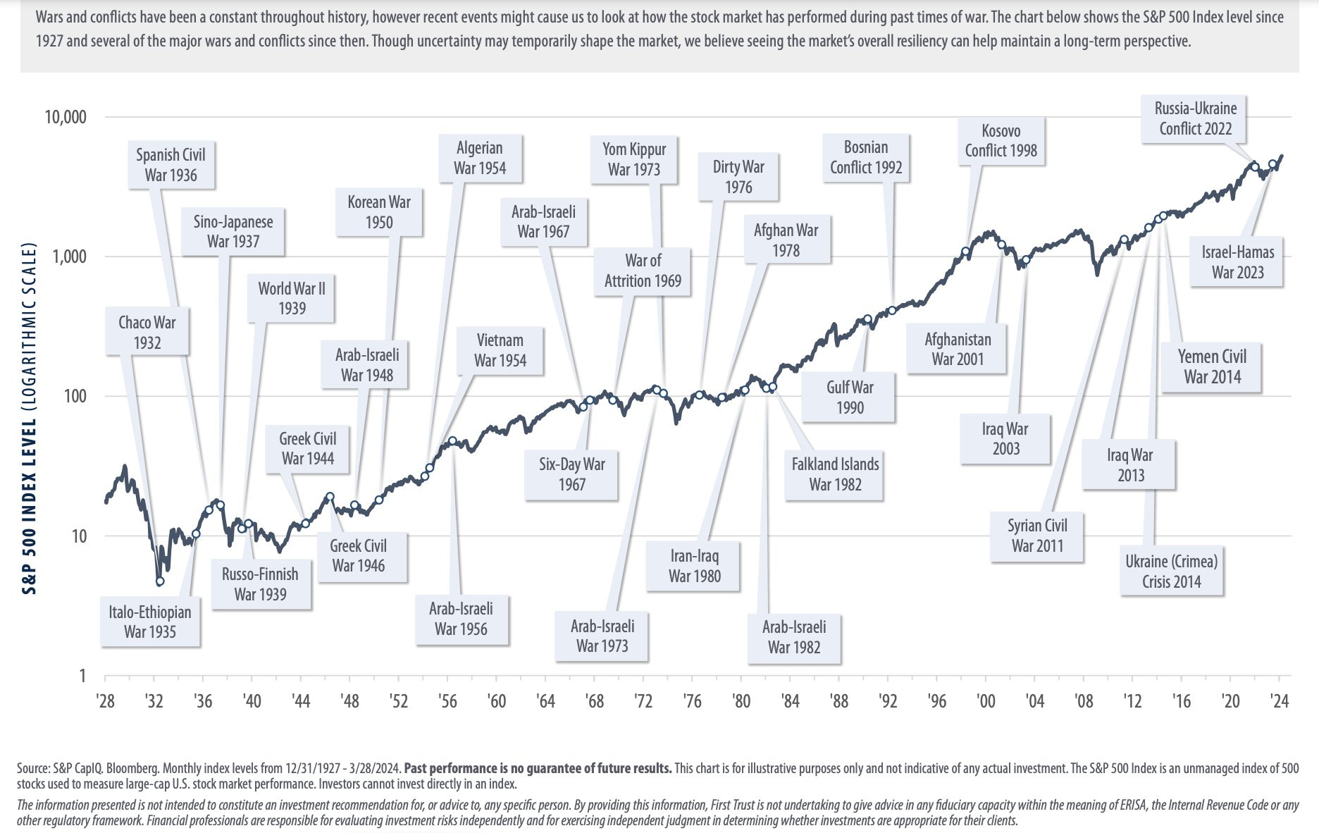 Este gráfico del S&P 500 desde 1927 en escala logarítmica lo resume mejor que cualquier argumento: guerras, conflictos y crisis geopolíticas han salpicado prácticamente cada década desde hace un siglo. Segunda Guerra Mundial, Vietnam, las guerras árabe-israelíes, el Golfo, Afganistán, Irak, Ucrania... La lista es interminable.