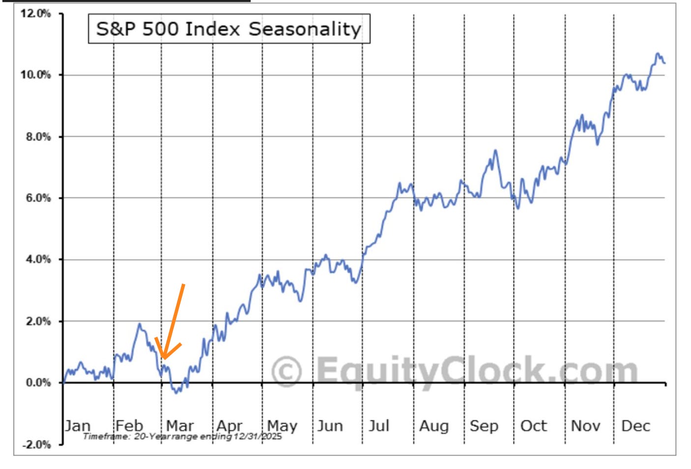 Por un lado, el S&P 500 está en su ventana estacional de debilidad y buscando suelo, probablemente en estos primeros días de marzo según los datos que acabamos de ver. Por otro lado, el VIX está en su pico estacional habitual.