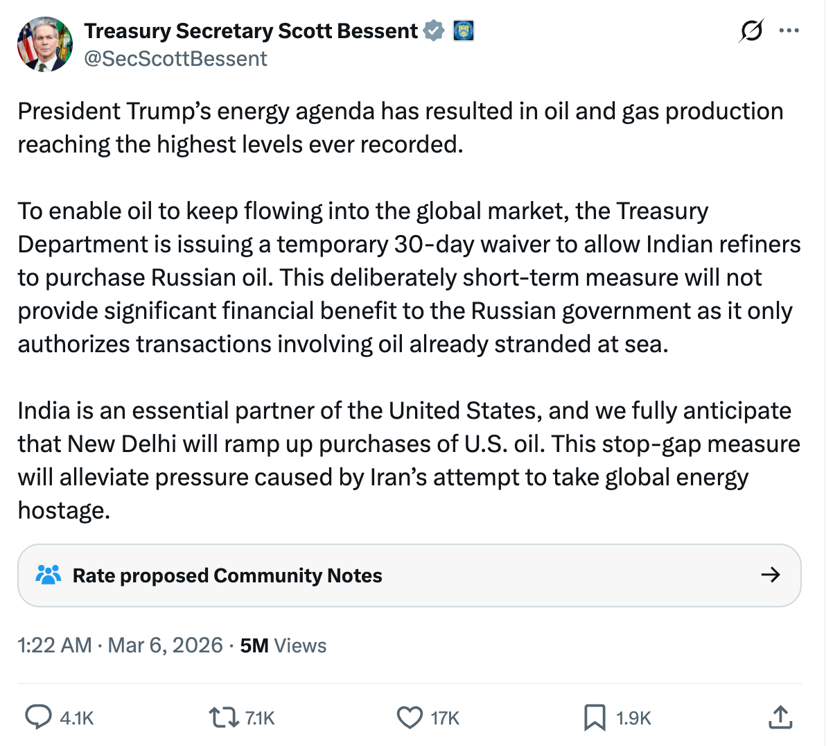 La primera señal de que están dispuestos a intervenir activamente llegó ayer mismo: el Departamento del Tesoro acaba de emitir una dispensa temporal de 30 días para que las refinerías indias puedan seguir comprando petróleo ruso (específicamente el que ya está en el mar) mientras India va aumentando progresivamente sus compras de crudo americano. Un movimiento que dice mucho sobre cómo piensan gestionar la transición.