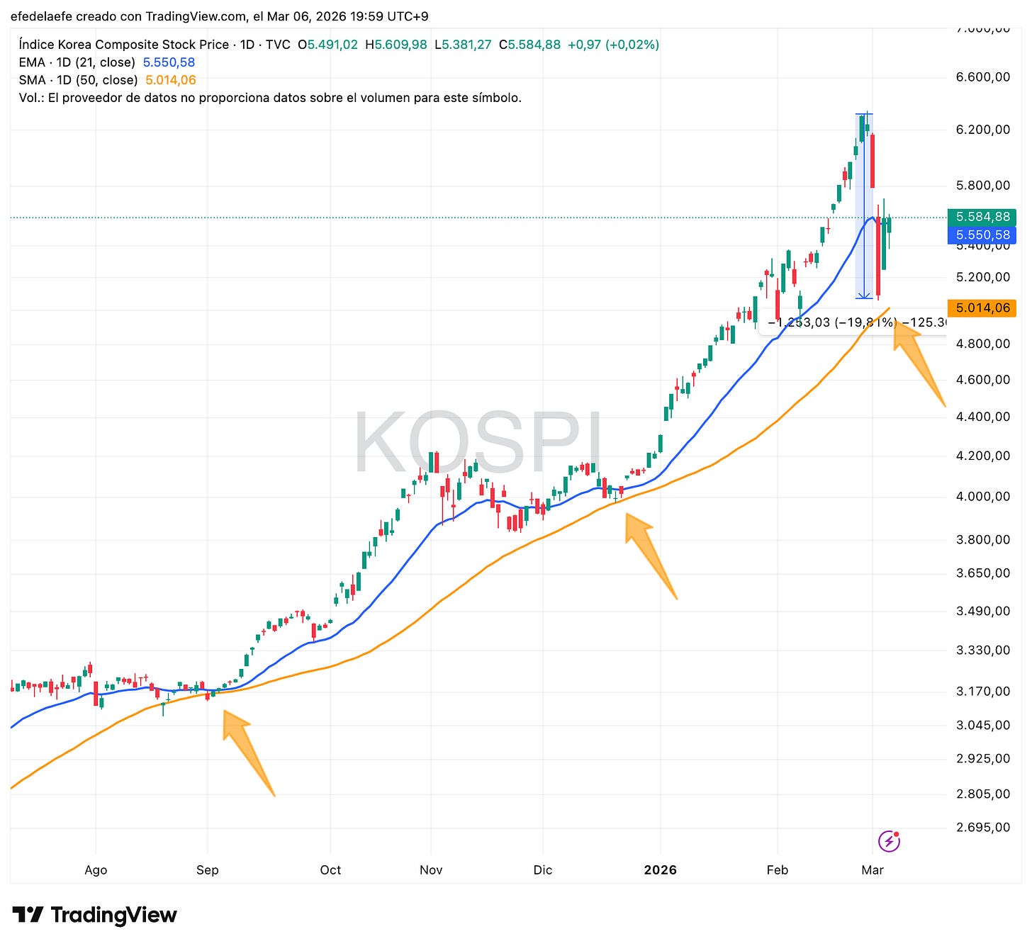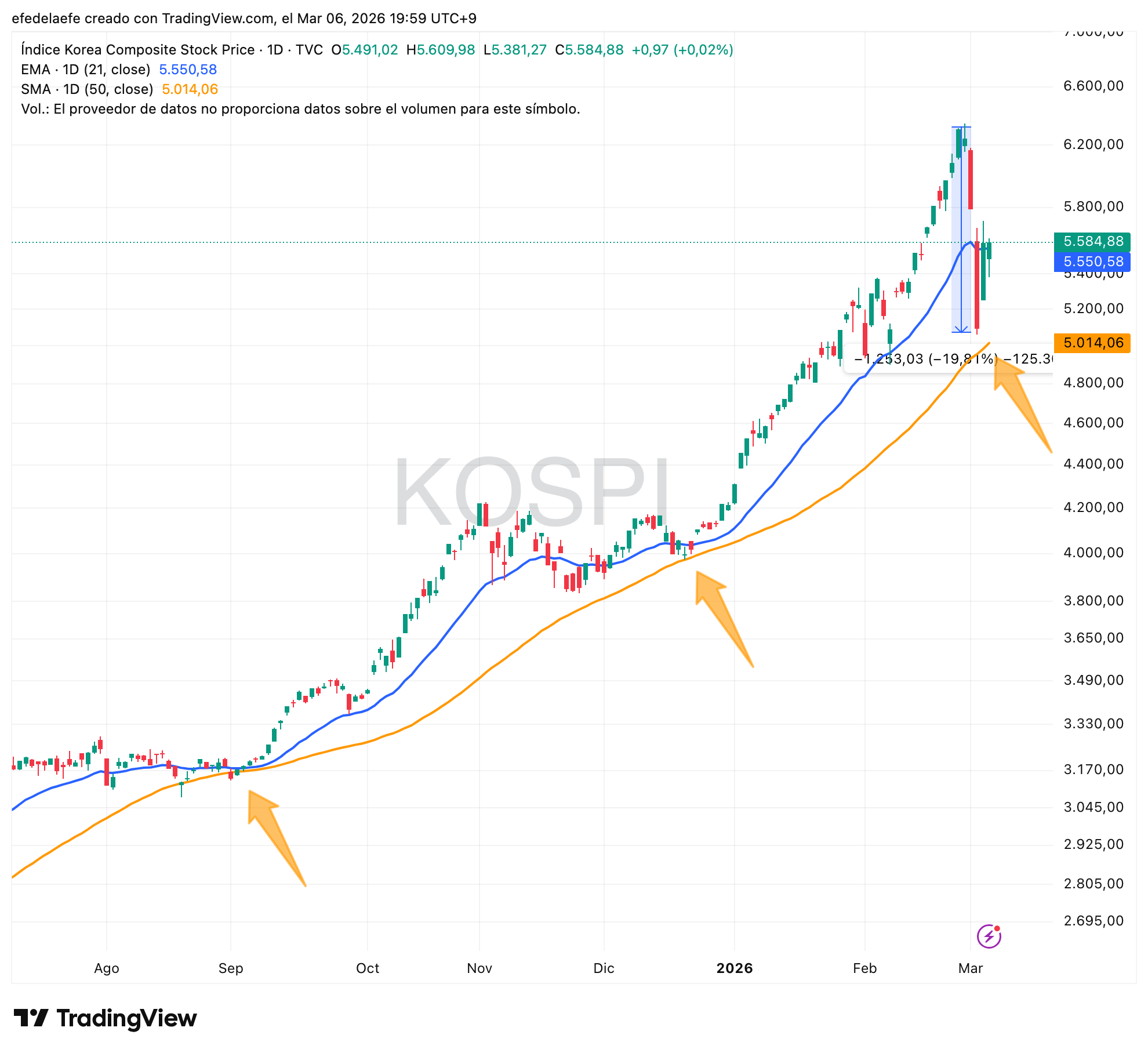 Corea es el emergente con mayor concentración de inversores retail apalancados del mundo. Cuando el mercado cae, las liquidaciones forzadas amplifican el movimiento de forma desproporcionada.