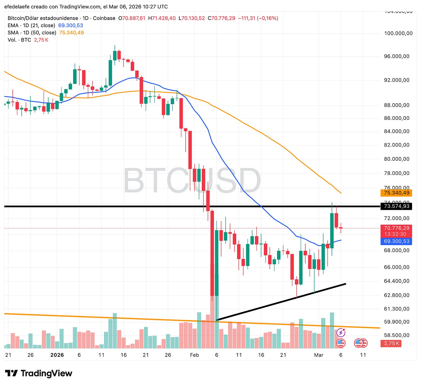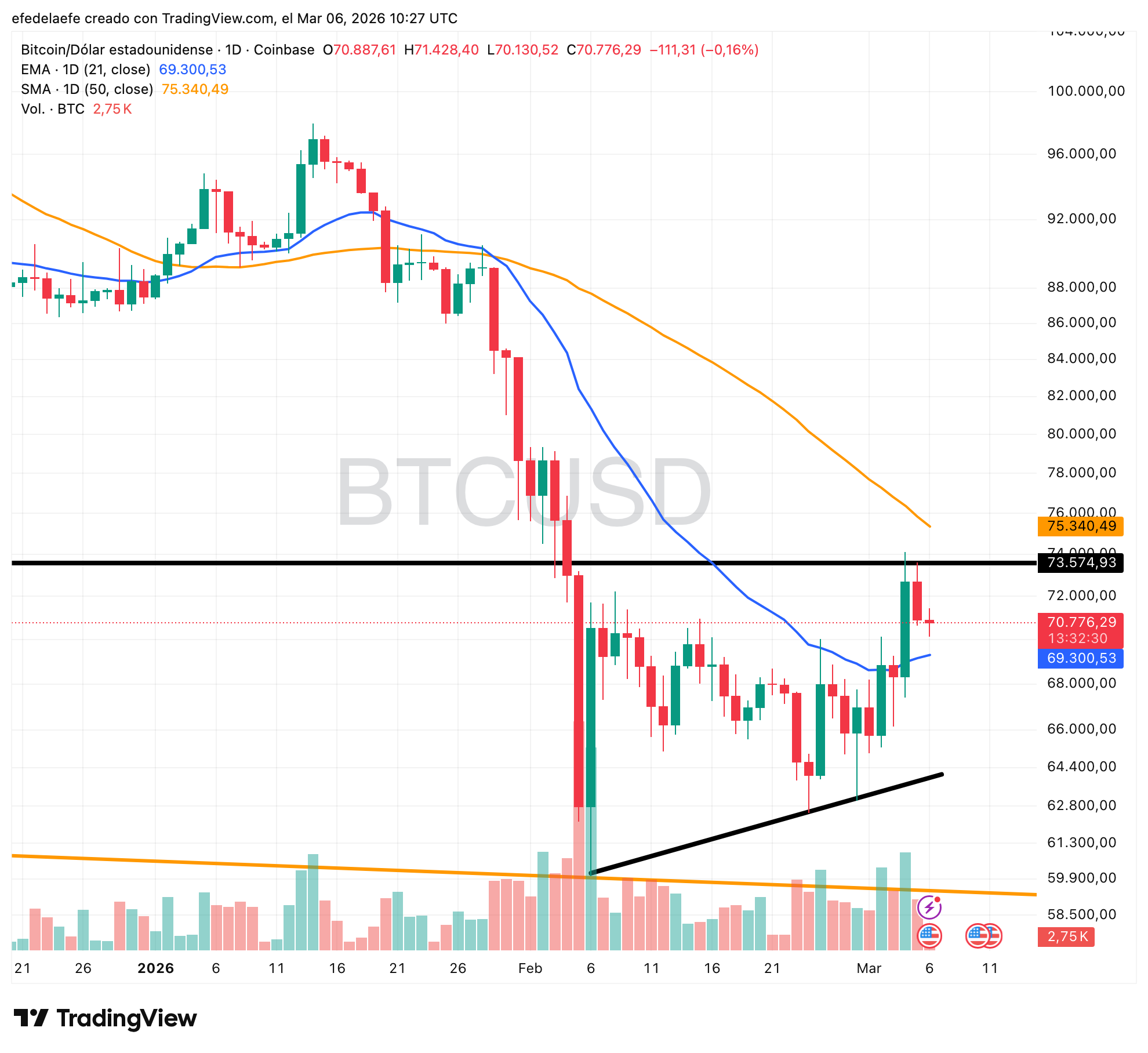 Bitcoin, reacción opuesta al oro, recupera la media de 21 días y choca contra la primera resistencia en 73k. 🟢