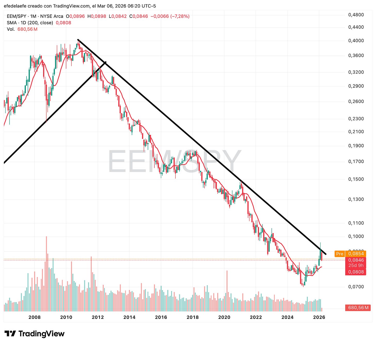 Frente al S&P 500, los emergentes han perdido la oportunidad de romper la tendencia y toca intentarlo de nuevo o continuar la tendencia a favor de los americanos. 🔴
