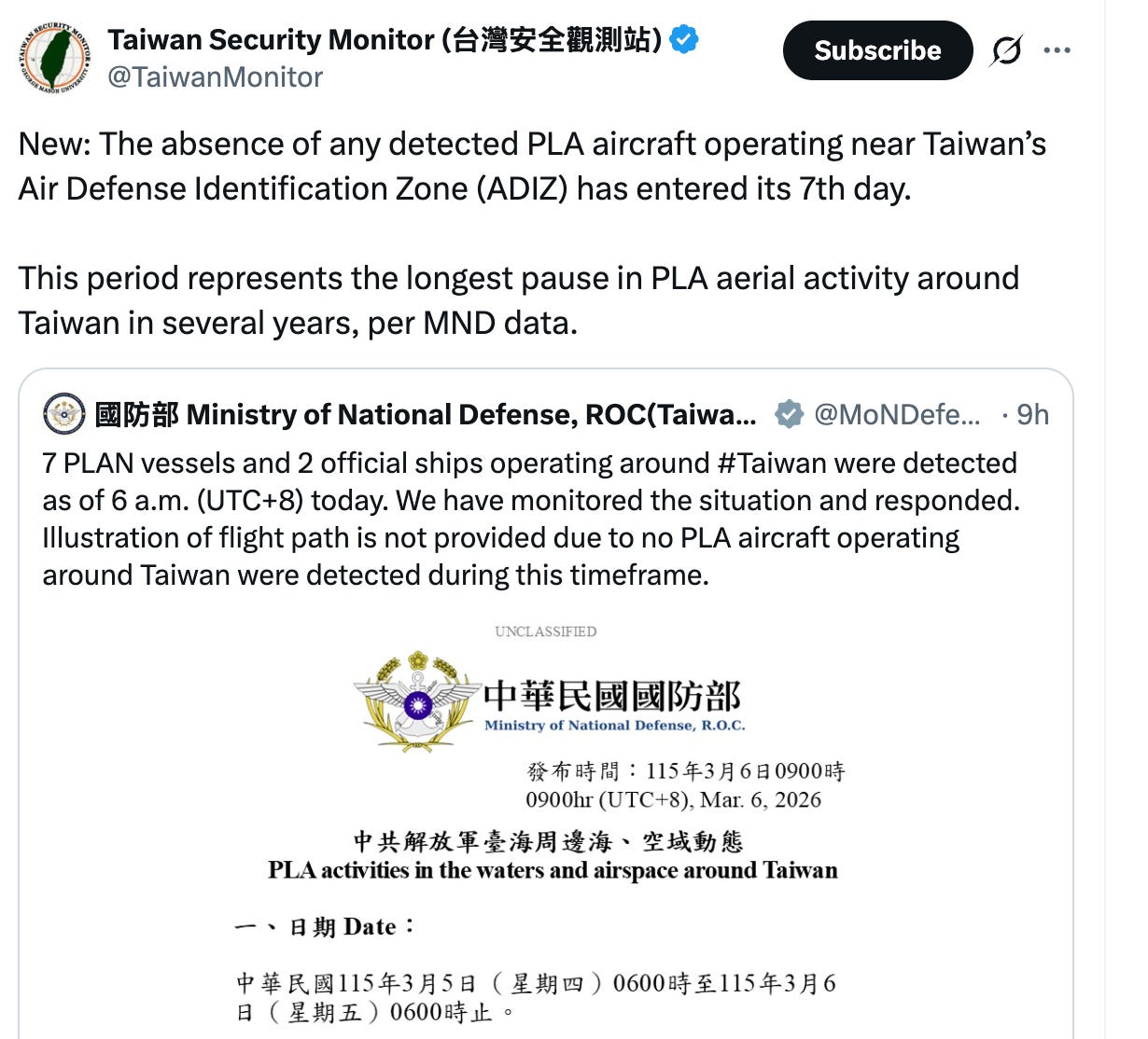 Así lo vemos expresamente en Taiwan Security Monitor: 7 días sin ver aviones militares chinos volando en torno a Taiwán, el mayor paréntesis en actividad aérea del PLAN alrededor de Taiwán en varios años.