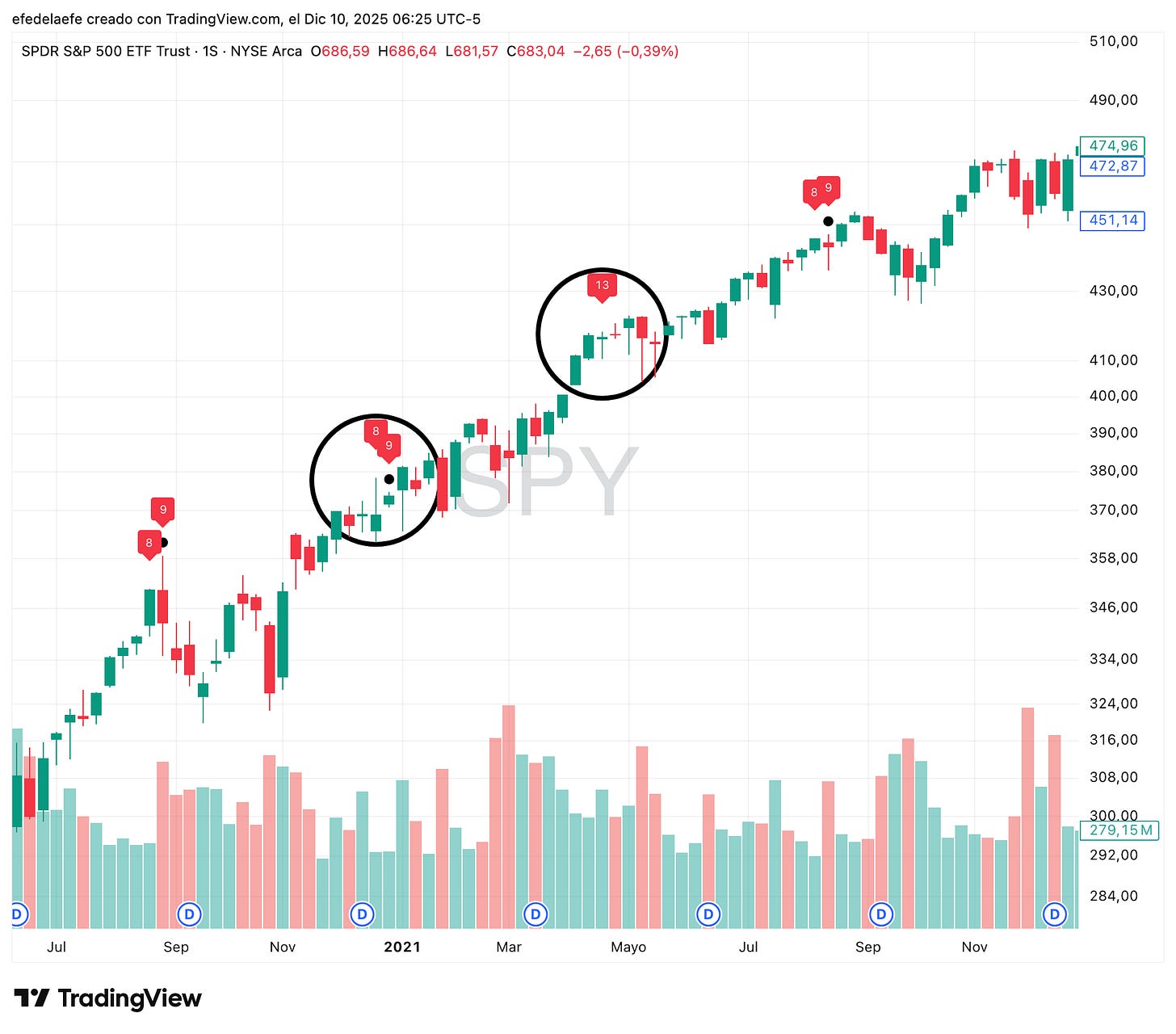 El resultado: El 9 suele marcar una pausa temporal (un descanso). El precio frena, pero la carrera podría no haber terminado todavía.