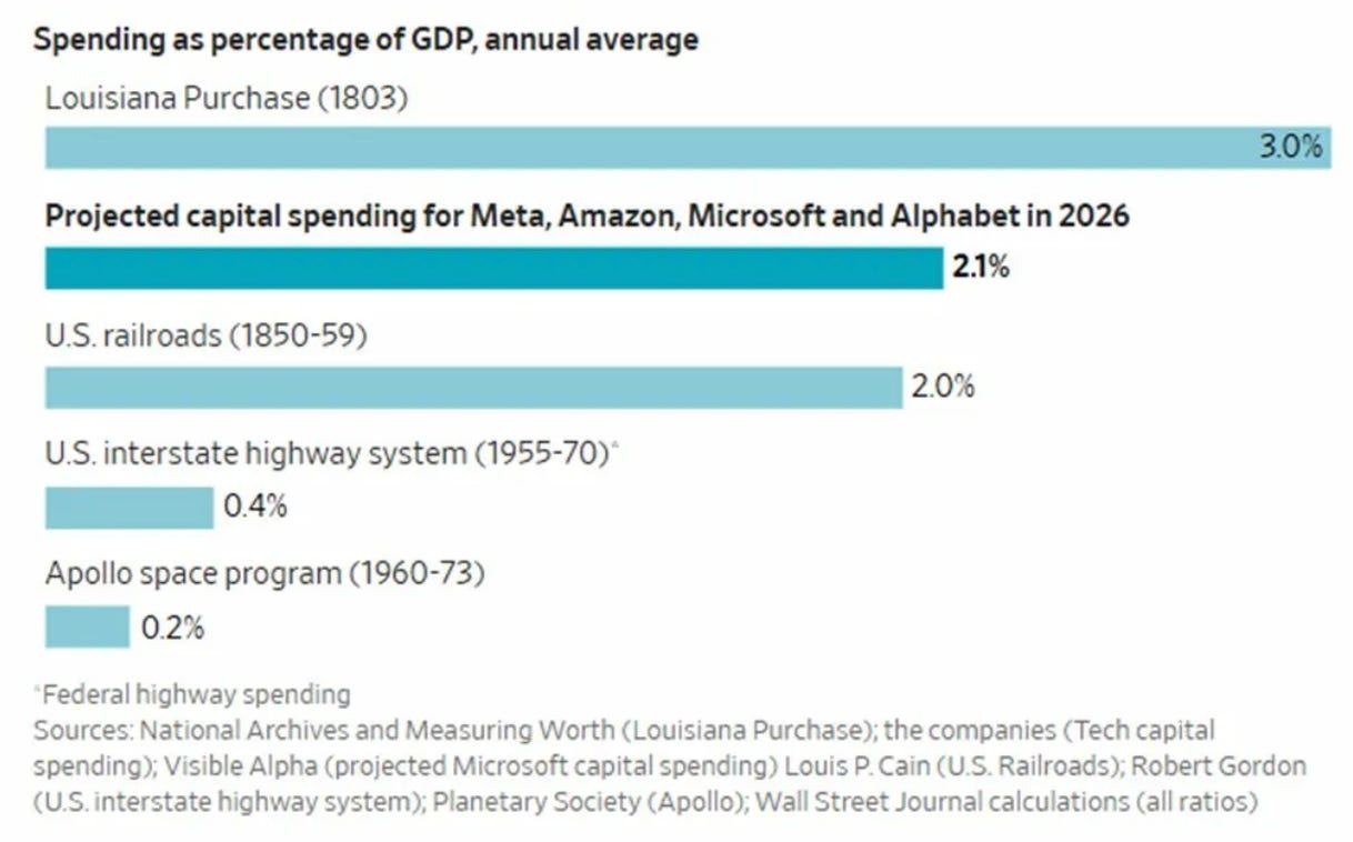 El capex combinado de Meta, Amazon, Microsoft y Alphabet en 2026 equivale al 2,1% del PIB americano. Cuatro empresas privadas. Un solo año.