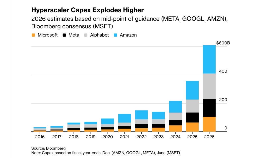 Amazon va a gastar $200.000 millones en capex este año. Alphabet, entre $175.000 y $185.000 millones. Meta, hasta $135.000 millones. Microsoft, en torno a $145.000 millones. En total, solo estos cuatro: aproximadamente $650.000 millones en un solo año. Un 67% más que en 2025, que ya fue un año récord.