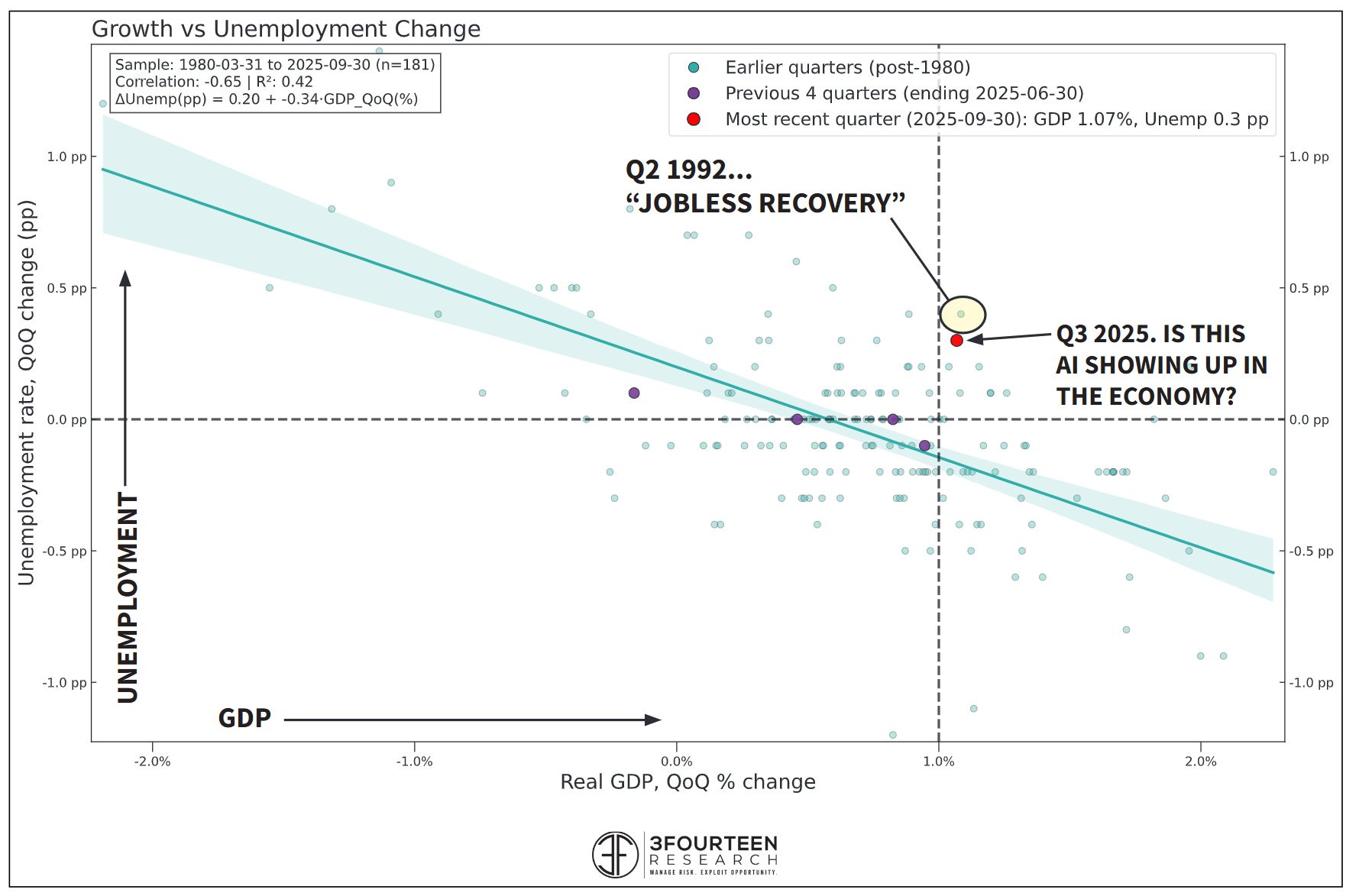 PIB creciendo al 1,07% trimestral: eso es sólido, por encima de la media. Y al mismo tiempo, el desempleo subiendo 0,3 puntos porcentuales. Ese punto rojo está en un cuadrante donde casi nadie ha estado en 45 años de datos. Desde 1980, solo hay otro trimestre que se le parezca: el Q2 de 1992, marcado en el gráfico como el “jobless recovery”: la recuperación sin empleo que siguió a la recesión de principios de los 90.