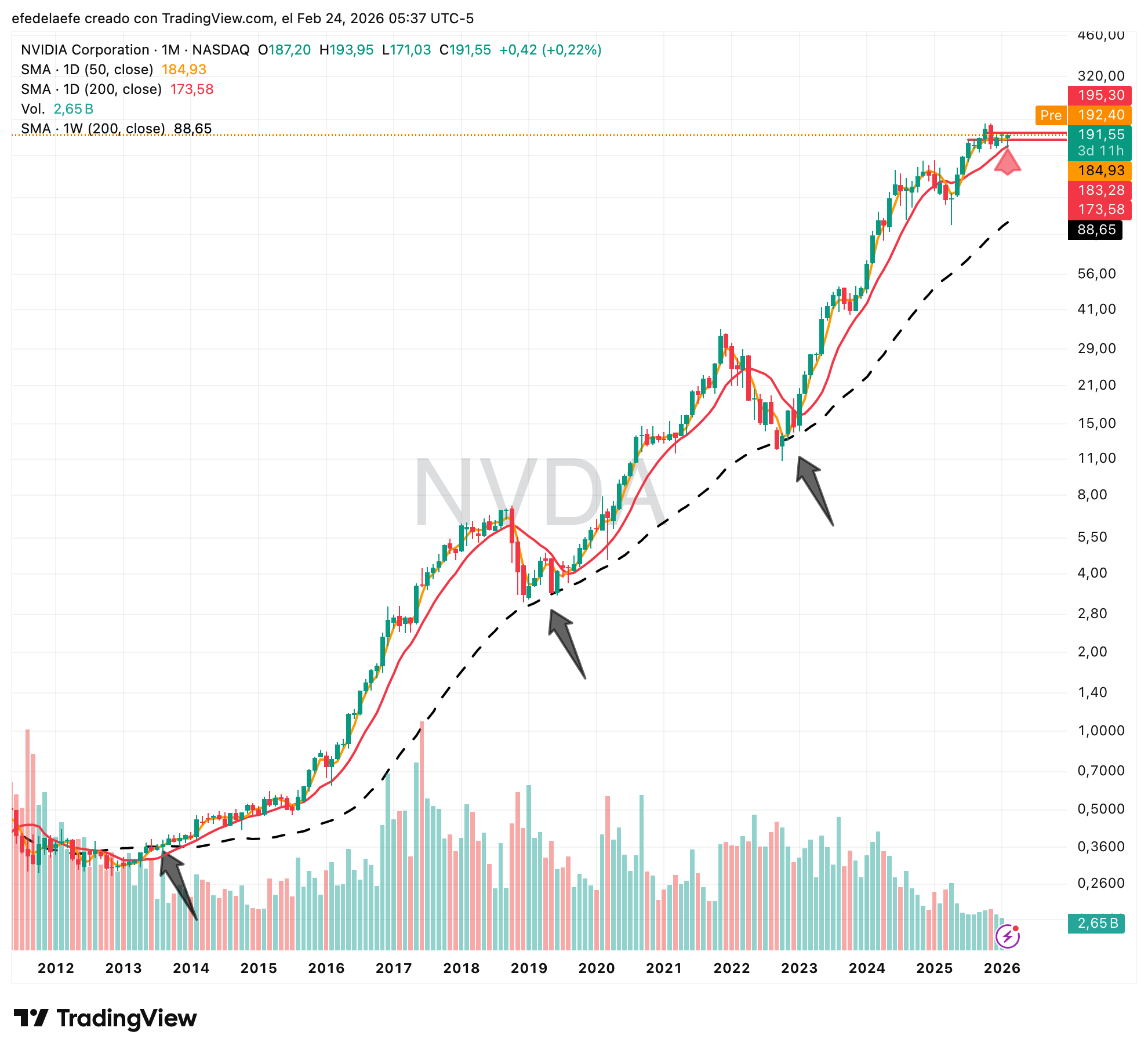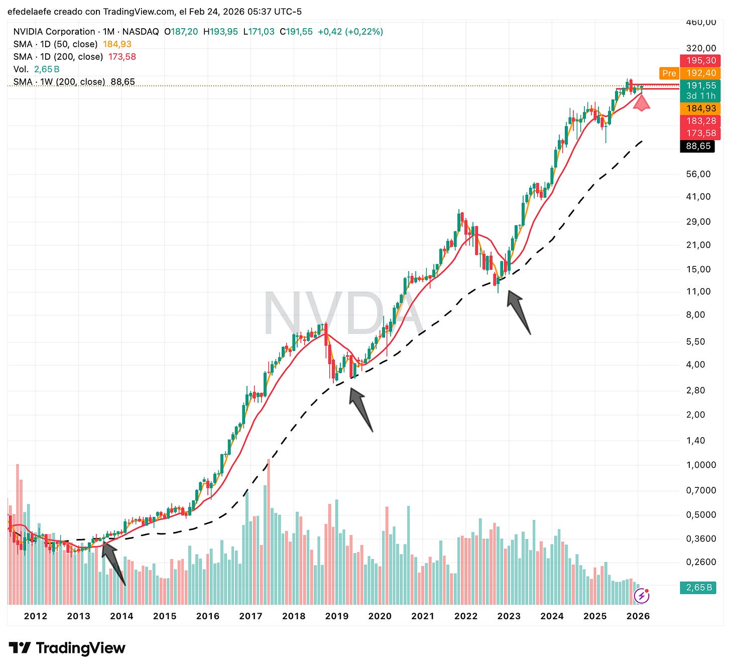 Desde entonces el precio de la acción ha pasado de $0,35 a $192 con solo dos descansos en la media de 200 semanas y es actualmente la compañía más grande del mundo por capitalización de mercado (4.66 billones de USD) a fecha de hoy, 24 de febrero de 2026.