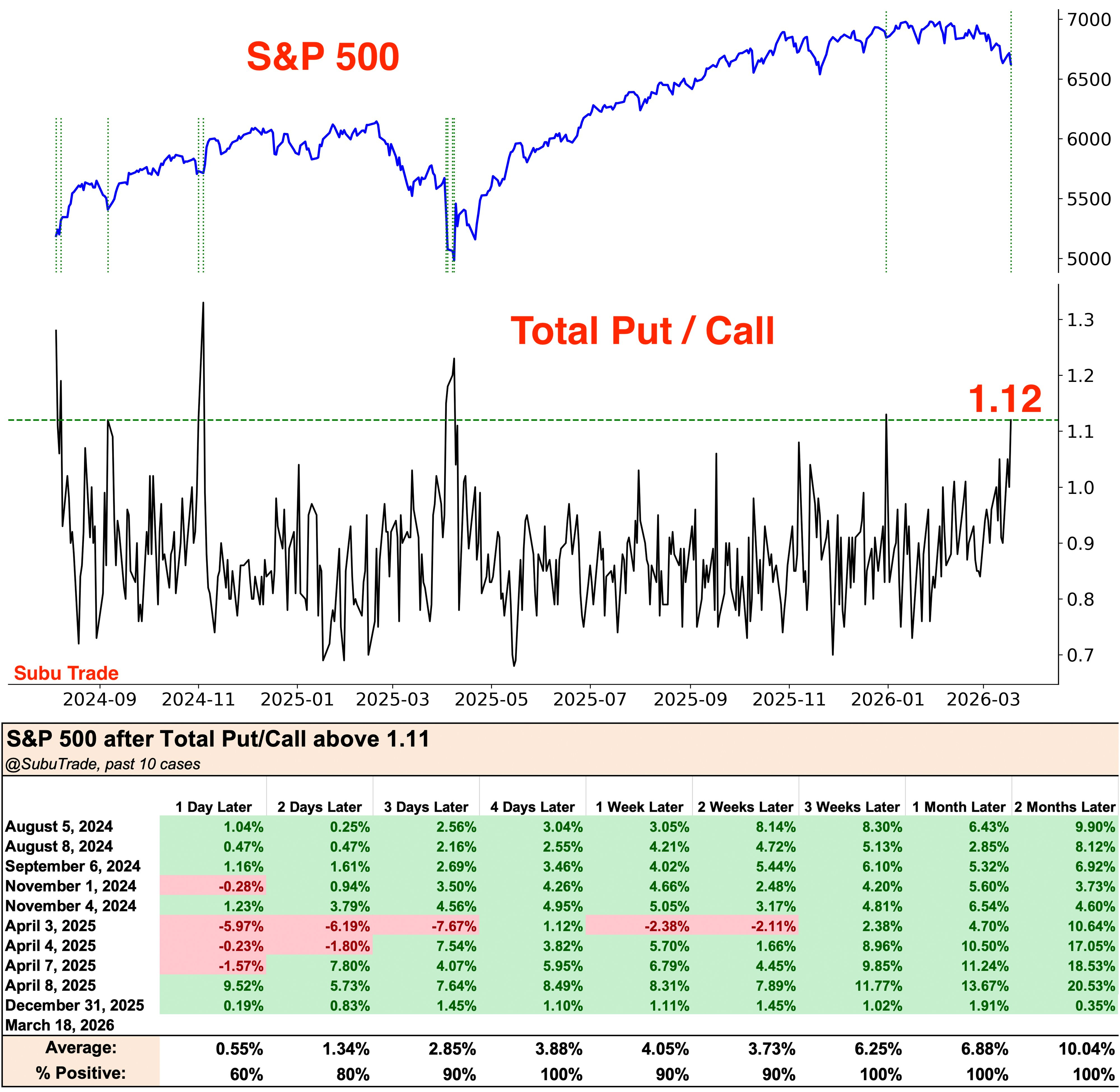 Este gráfico de SubuTrade pone ese número en contexto. En los últimos dos años, el total put/call ha superado 1.11 en diez ocasiones. En el 100% de los casos el S&P500 terminó en positivo a un mes y a dos meses. La rentabilidad media a dos meses en esos diez casos fue del 10%.
