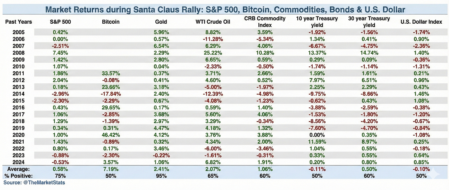 Rendimiento: Con un retorno medio del 2.41%, supera ampliamente al S&P 500. Estadísticamente, el Oro parece ser la apuesta más segura y rentable durante el rally de Santa Claus, funcionando mejor incluso que las acciones.
