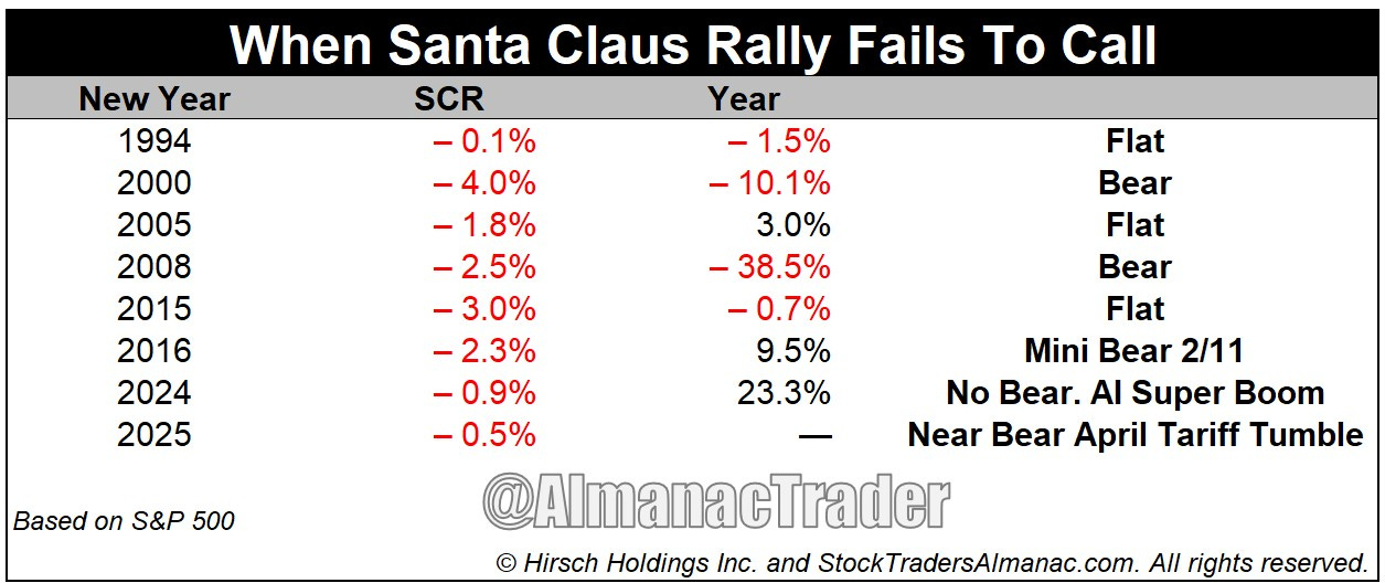 Si NO hay Rally (”Santa fails to call”): suele preceder a mercados bajistas (Bear Markets) o momentos en los que las acciones caen a precios más bajos más adelante en el año.