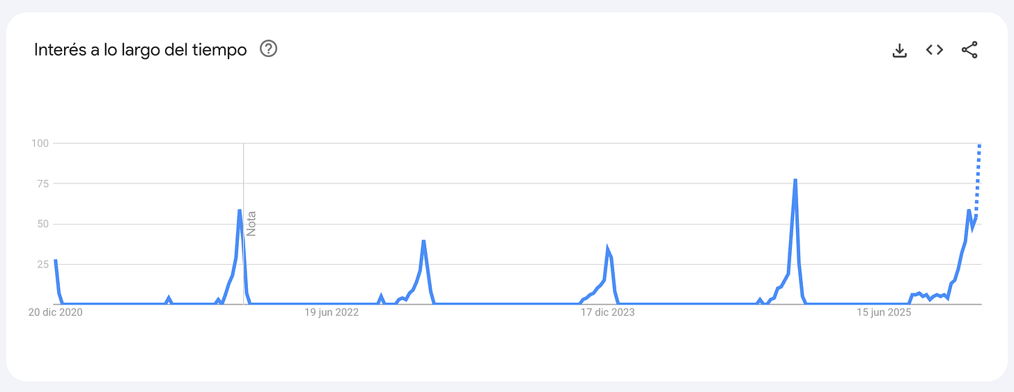 Como se puede observar en el gráfico de búsquedas de Google Trends, los inversores comienzan a mostrar interés por el rally de Santa Claus cada año desde finales de noviembre.