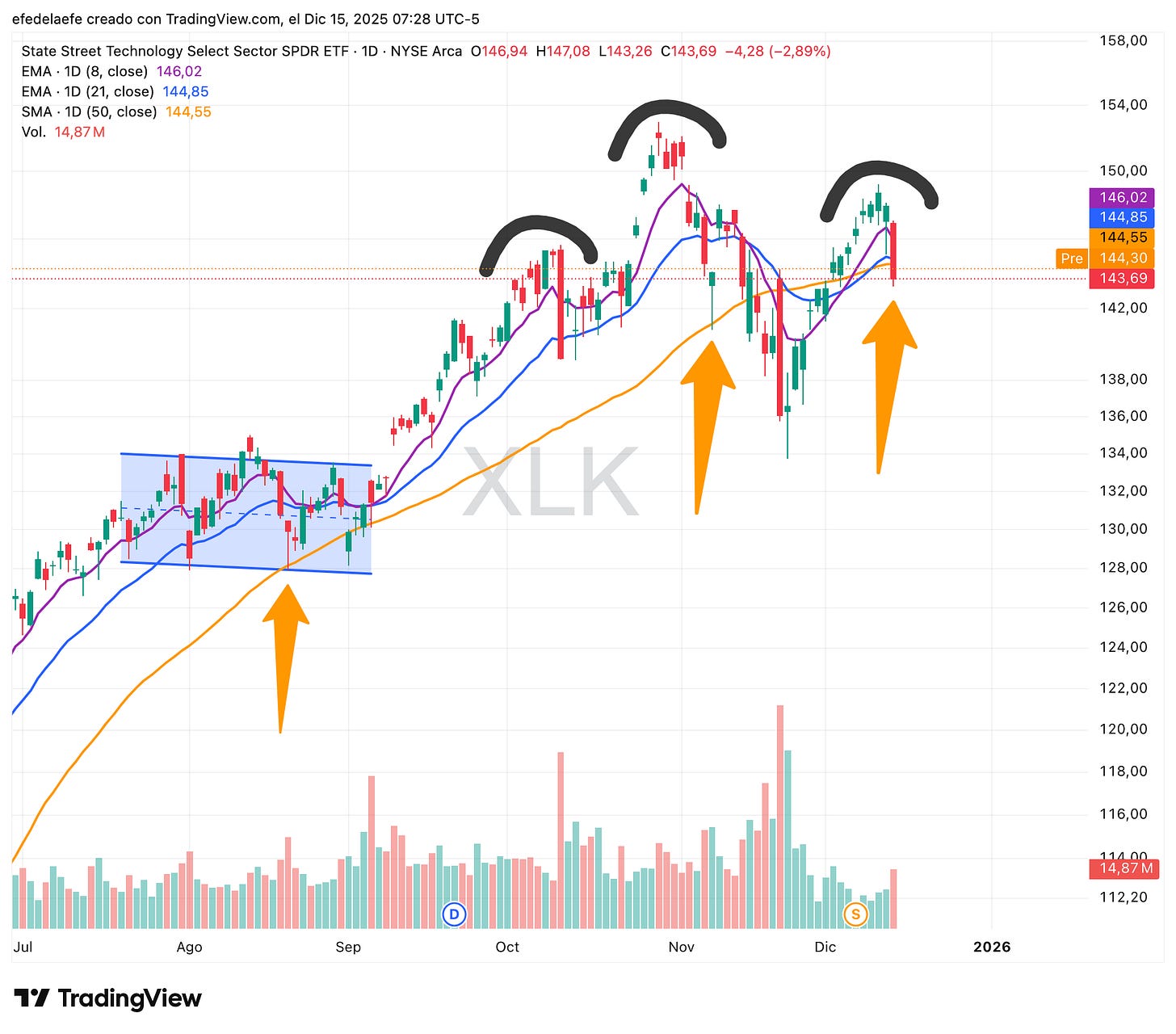 El sector tecnológico, arrastrado por Oracle, es el que más está sufriendo (junto con ‘Utilities’), presenta una formación bajista con Lower High: no ha conseguido subir por encima de los máximos anteriores. No es necesariamente algo negativo, está haciendo una corrección en el tiempo con el precio estancado 2 meses en torno a 145. Necesita recuperar las medias de corto plazo. 🟡