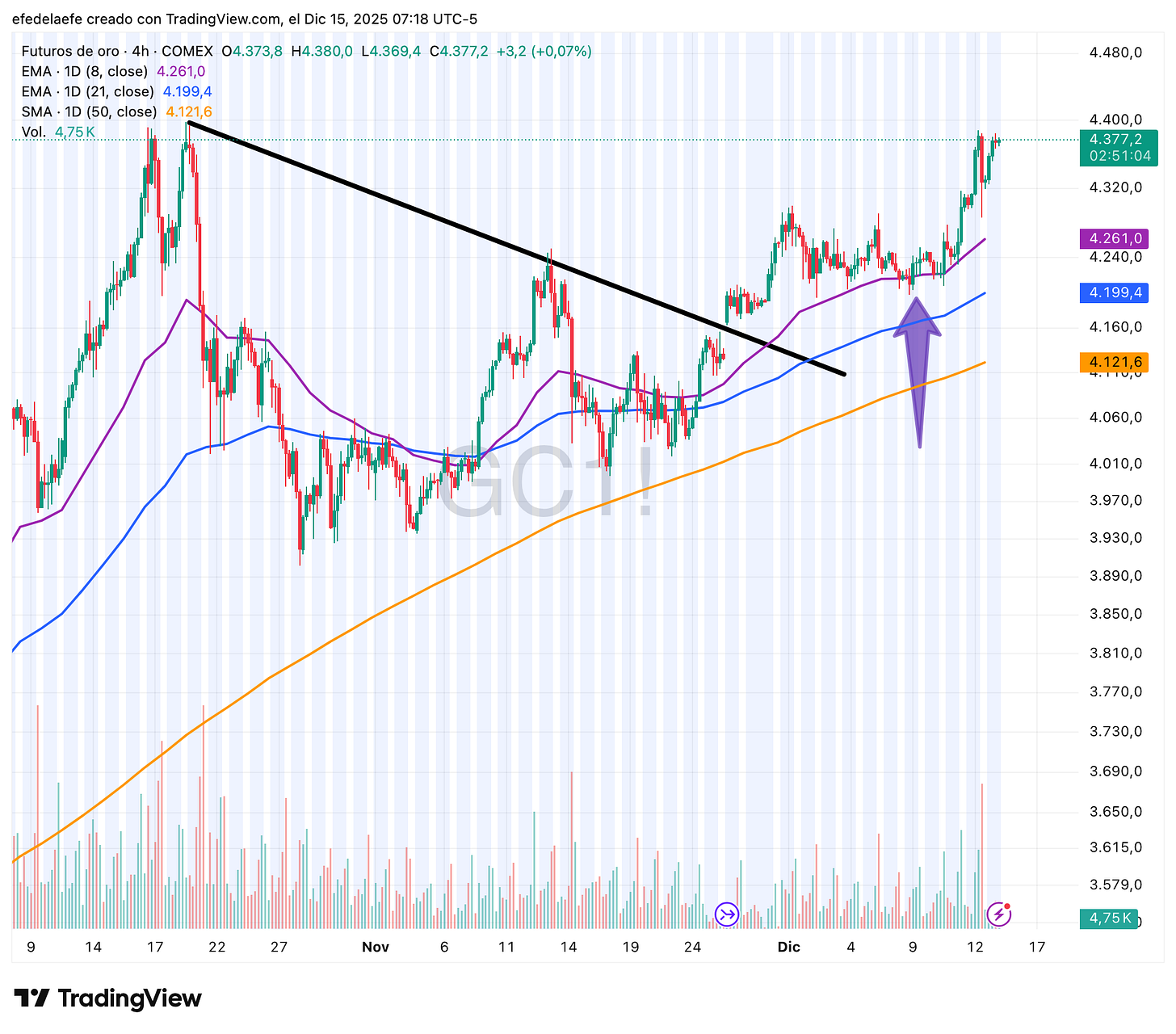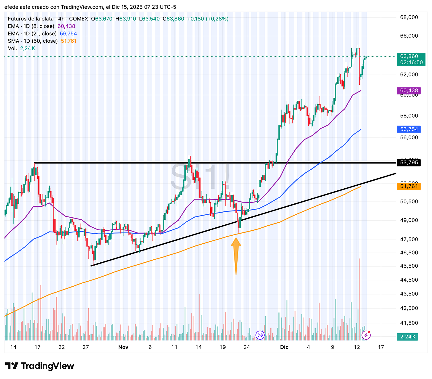 Vuelve a las subidas con tranquilidad, la media de 8 días (morada) es el soporte de momento, por encima de ahí, seguirá el camino que va marcando la plata. 🟢