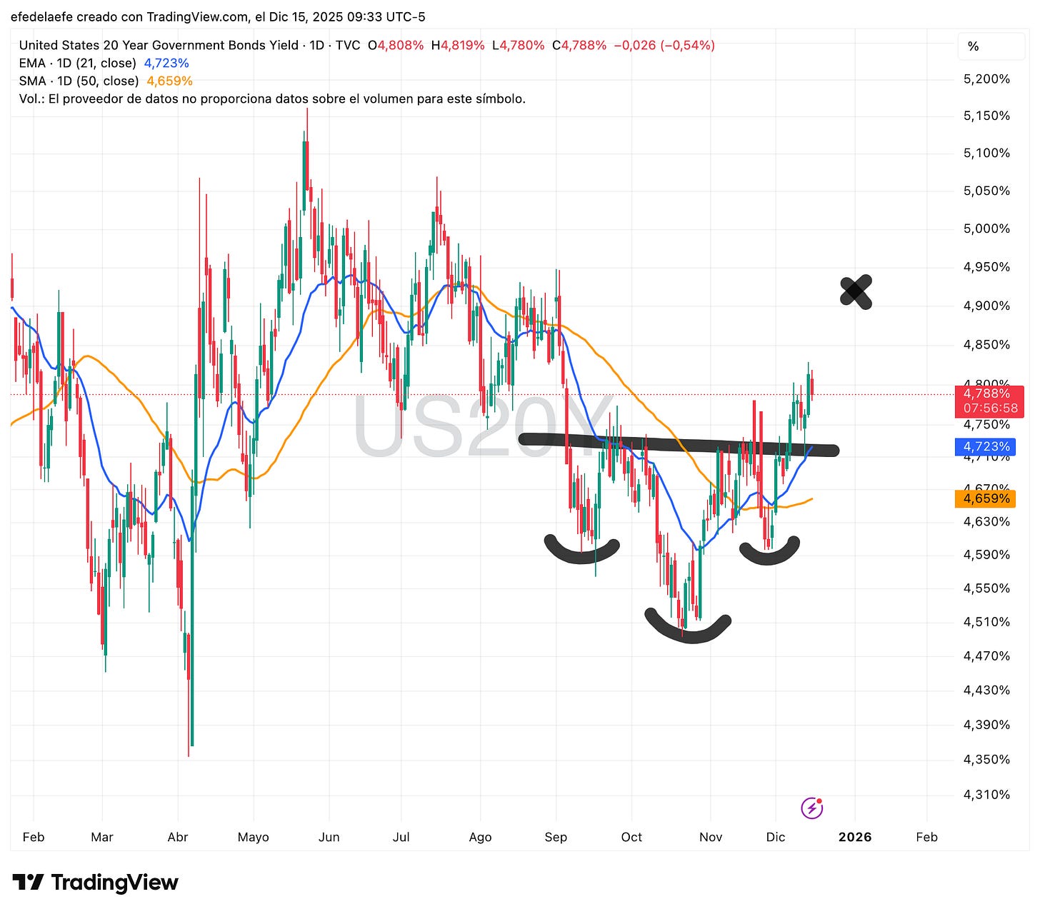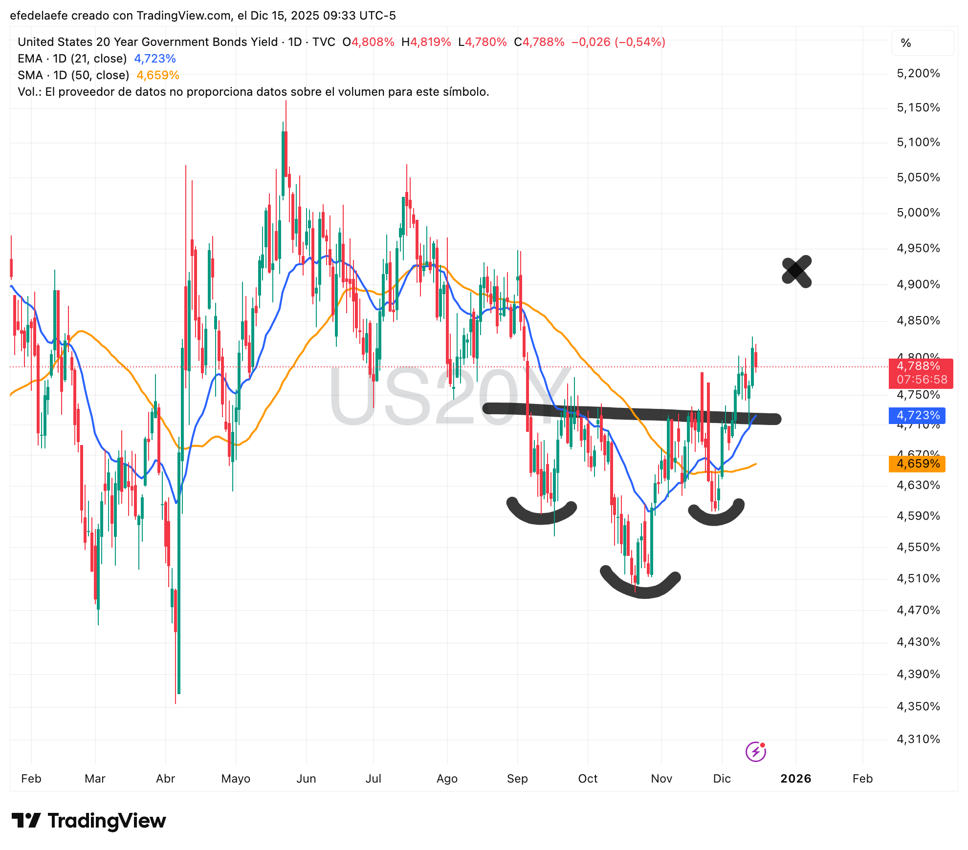 Como es normal, el mismo movimiento está presente en los tipos de interés del 20Y americano cuyo objetivo nos acercaría de vuelta casi al 5%.