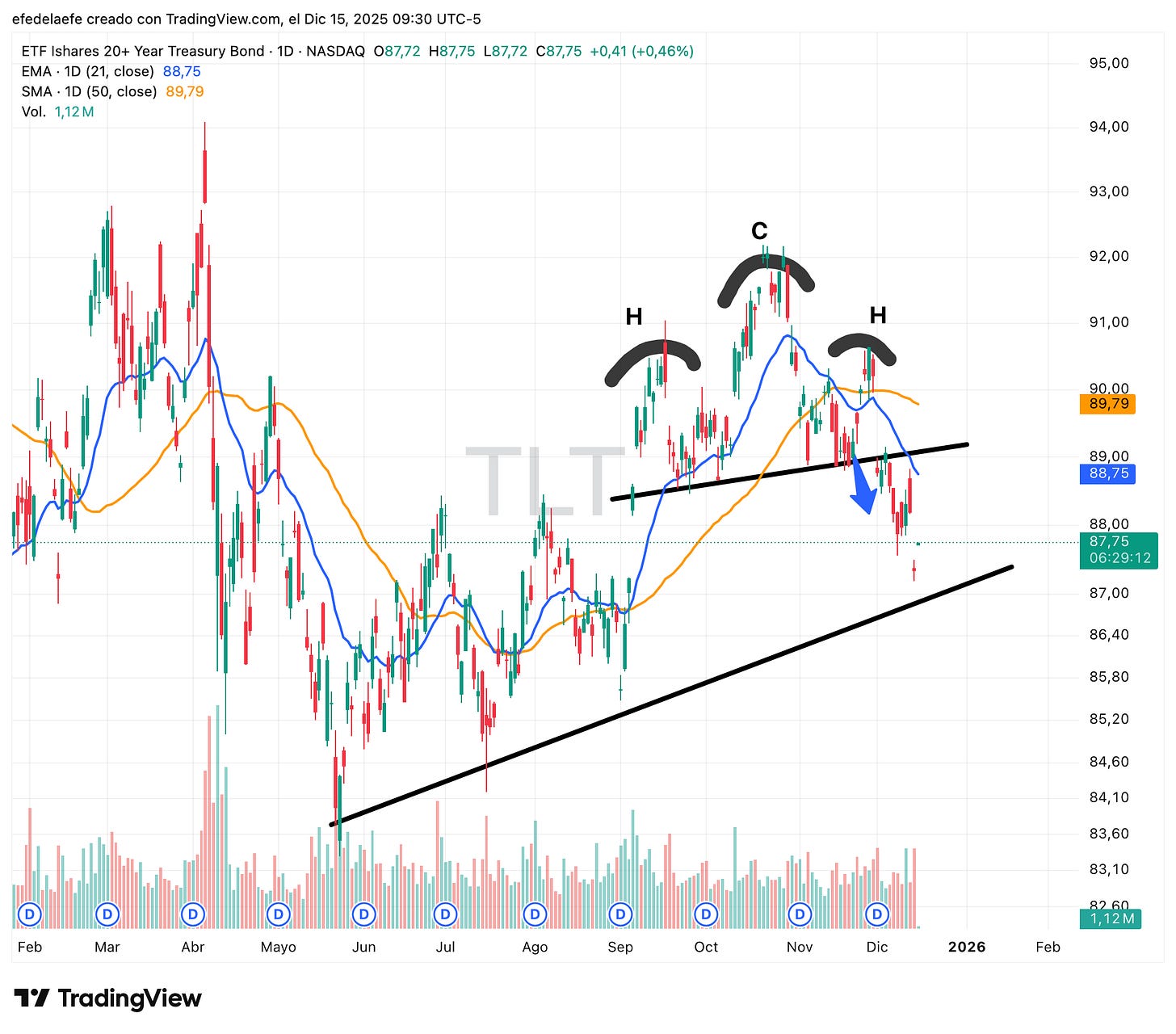 Para el comportamiento de la Renta Fija americana utilizo como referencia el ETF TLT. Como indicaba en el anterior Recap, parecía estar haciendo una figura tradicional del análisis técnico que se llama Hombro-Cabeza-Hombro. La rotura del soporte de los hombros nos indica un objetivo de entorno $86. 🟡