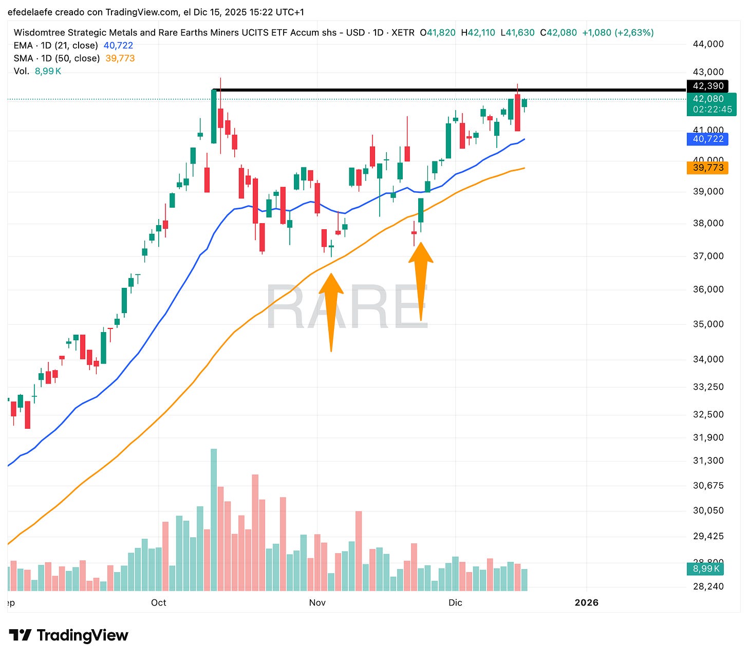 Hace unas semanas hice un post especial sobre Tierras Raras. Como os comentaba en su momento, el sector, a través de su ETF RARE, se encontraba en un descanso en la tendencia alcista. La media de 50 días (naranja) se ha mostrado como un buen soporte para entrar y el precio se encamina a nuevos máximos. 🟢
