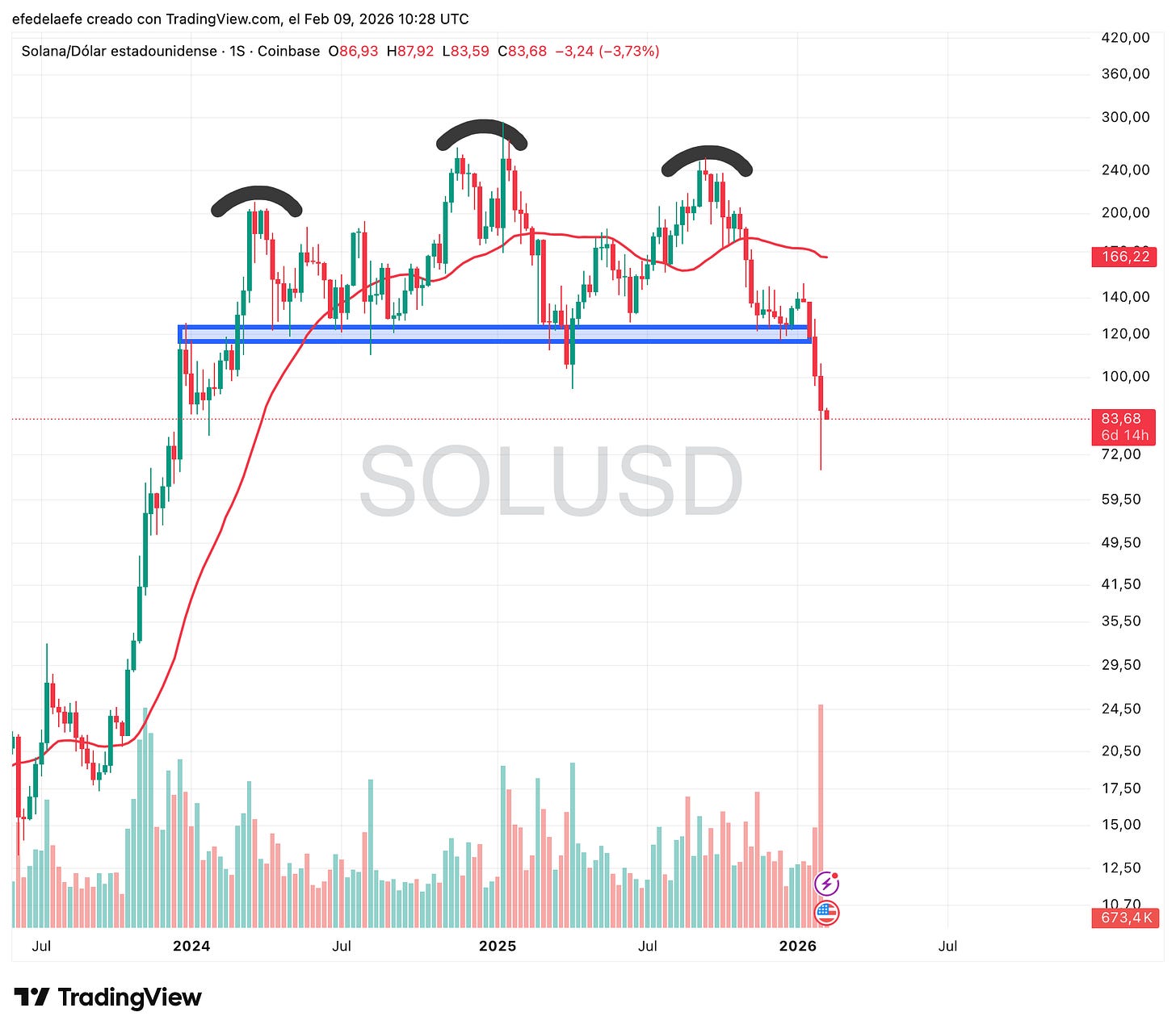 Gráfico absolutamente claro. Tres intentos fallidos de superar la zona de $200-$260 (marcados con los arcos negros), ha perdido la zona de demanda en torno a $120 y la línea psicológica de los $100.