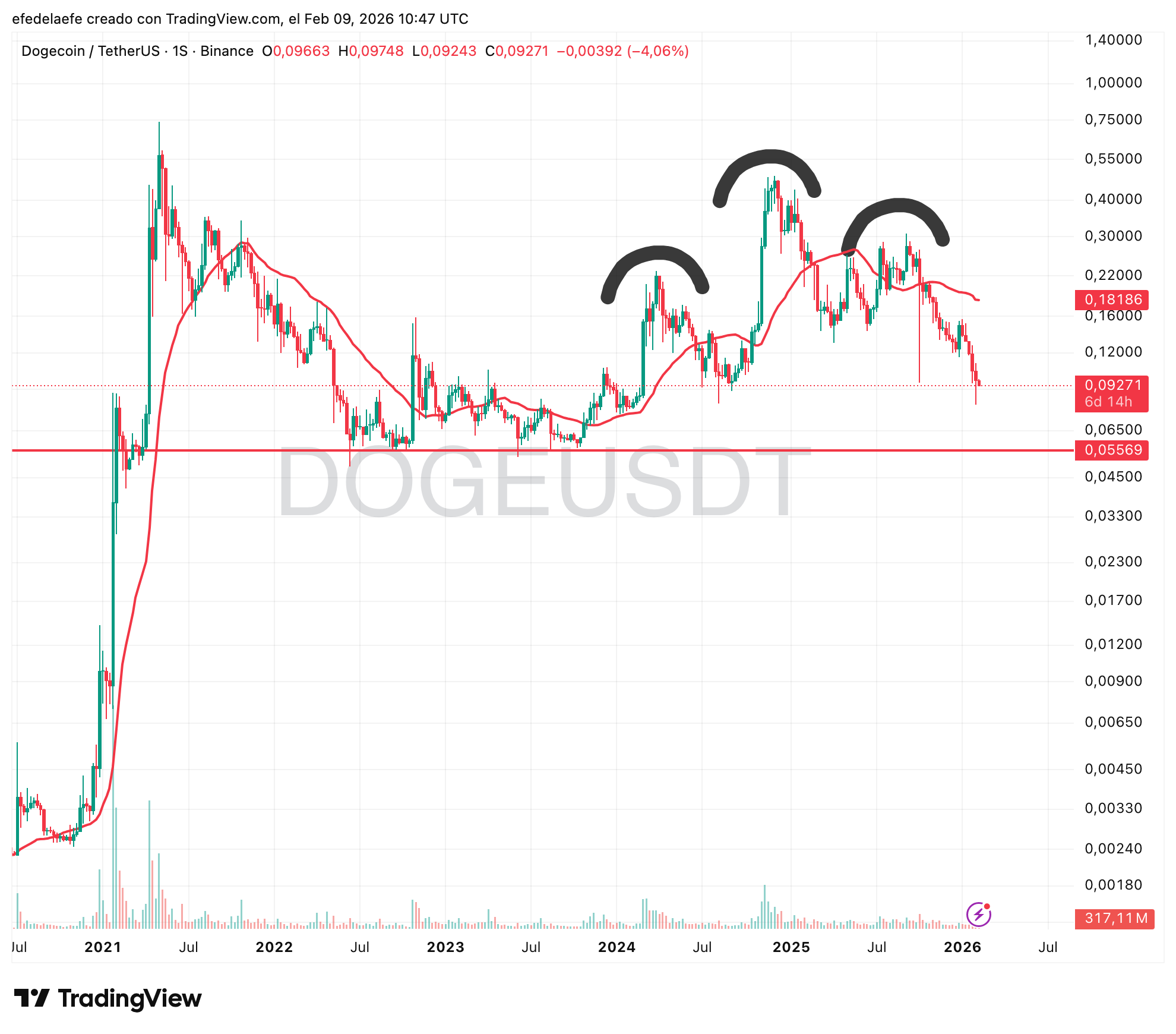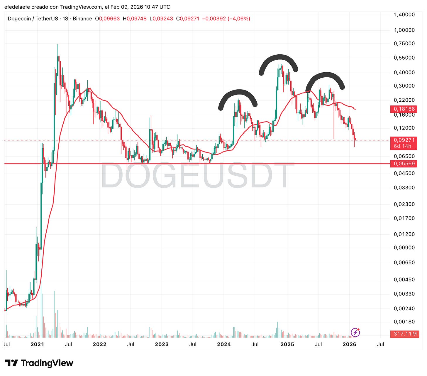 De nuevo la misma estructura, con soporte en torno a $0.055, otro 40% por debajo. 🔴