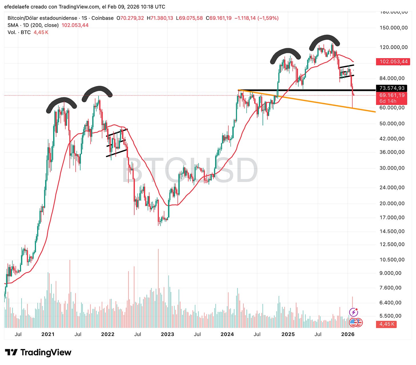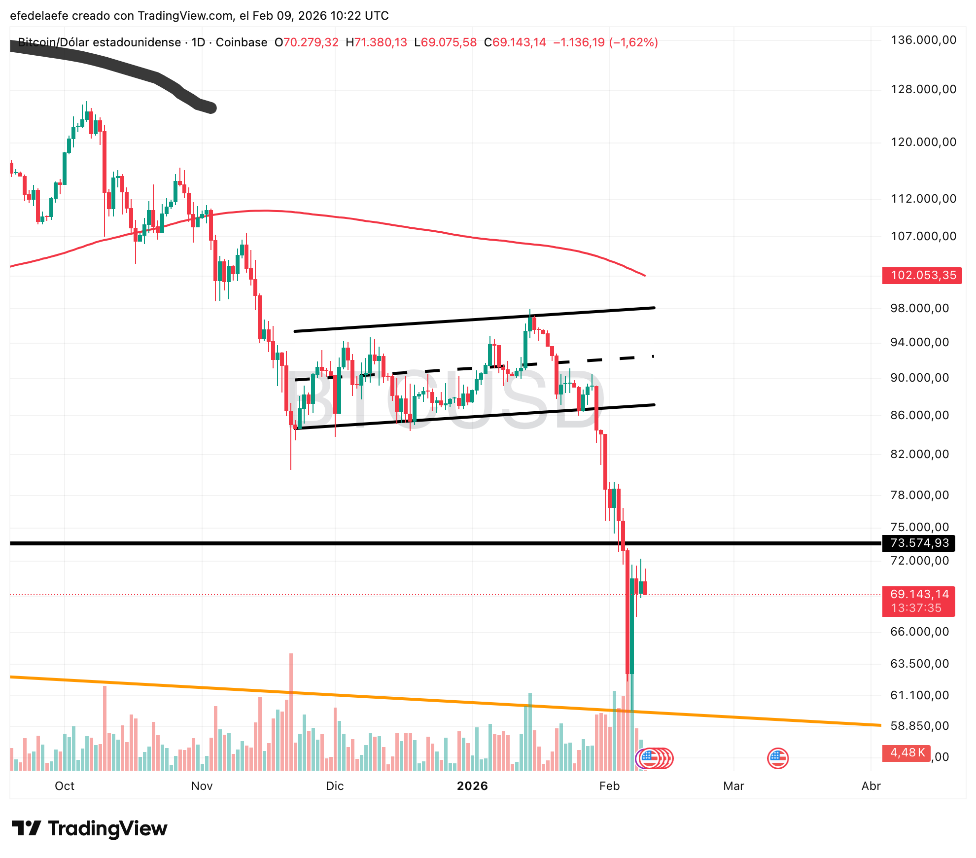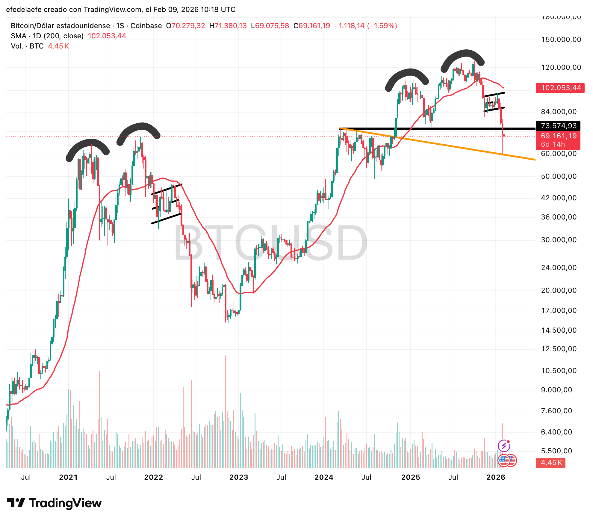 Este es el primer intento real de suelo, pero de momento se queda en rebote por sobreventa. Mientras no recupere los $73.000 con cierre semanal por encima, sigue siendo bajista. 🔴