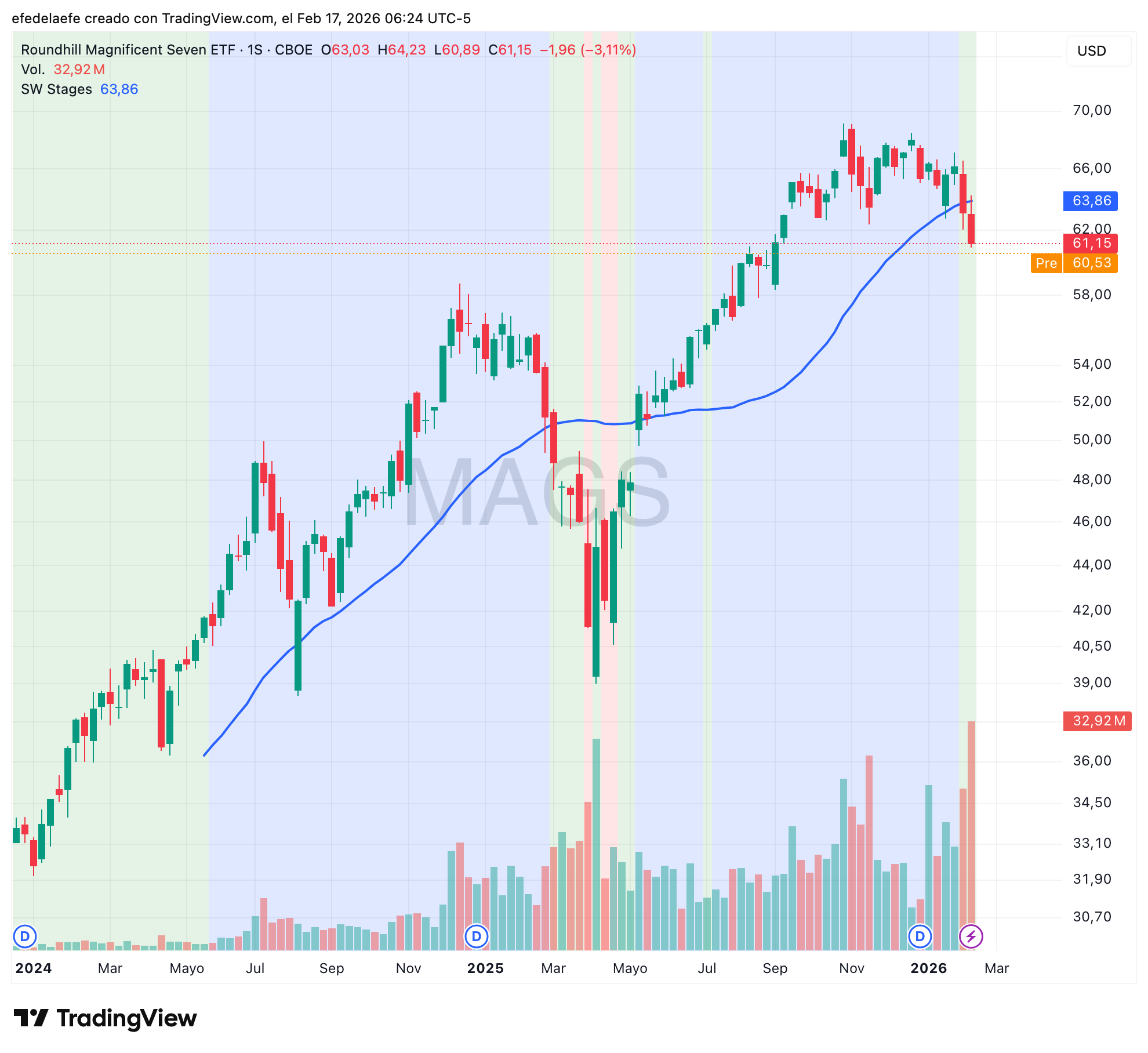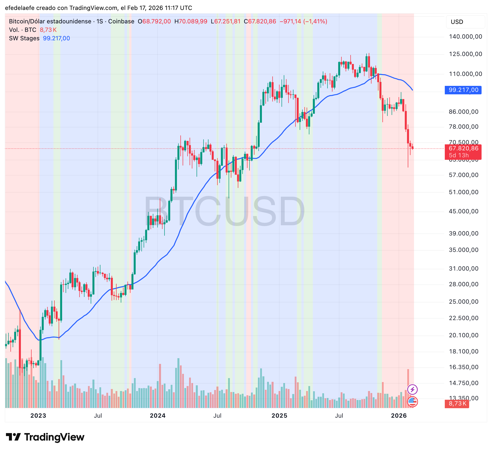Asà que ahora mismo estamos en un momento intermedio que puede interpretarse como oportunidad de compra PERO lo que lo hace especialmente delicado es el volumen, fÃjate que la última vela bajista (la de la ruptura) viene acompañada del volumen más alto de todo el gráfico. Eso no es una corrección normal dentro de una Etapa 2 sana, parece distribución institucional.