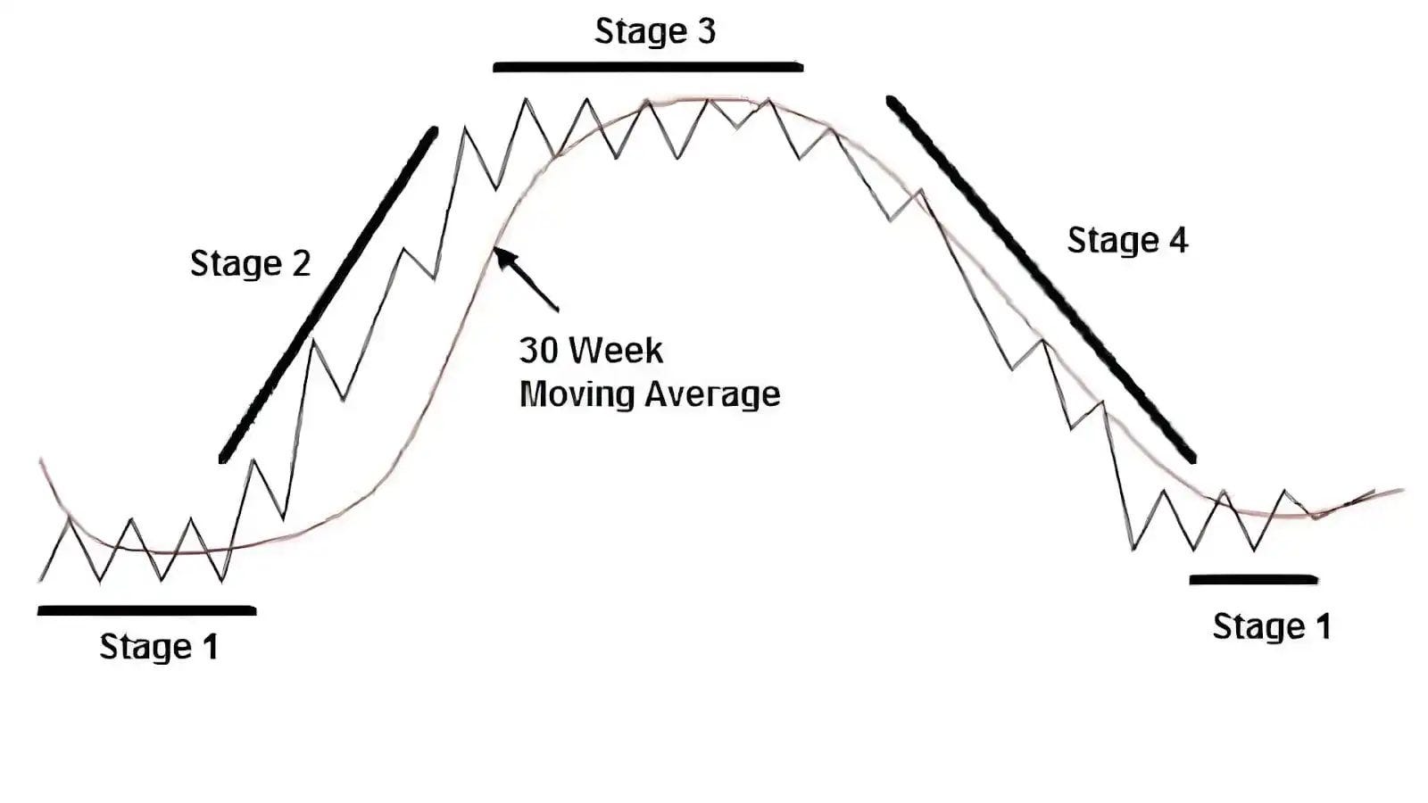 La Etapa 4 es el declive — el precio cae por debajo de la MM30. Territorio a evitar.