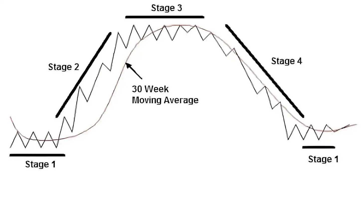 El Análisis de Etapas es un método desarrollado por Stan Weinstein que divide el ciclo de vida de cualquier activo en cuatro fases, usando la media móvil de 30 semanas como guÃa principal: