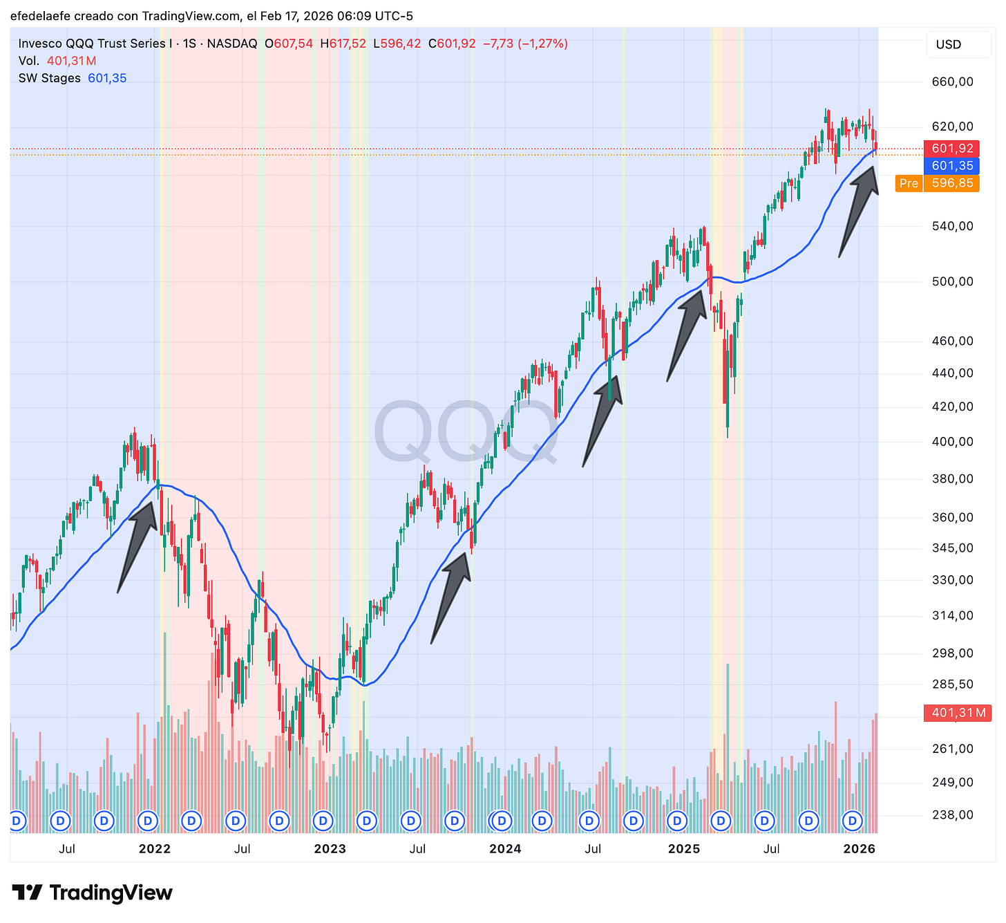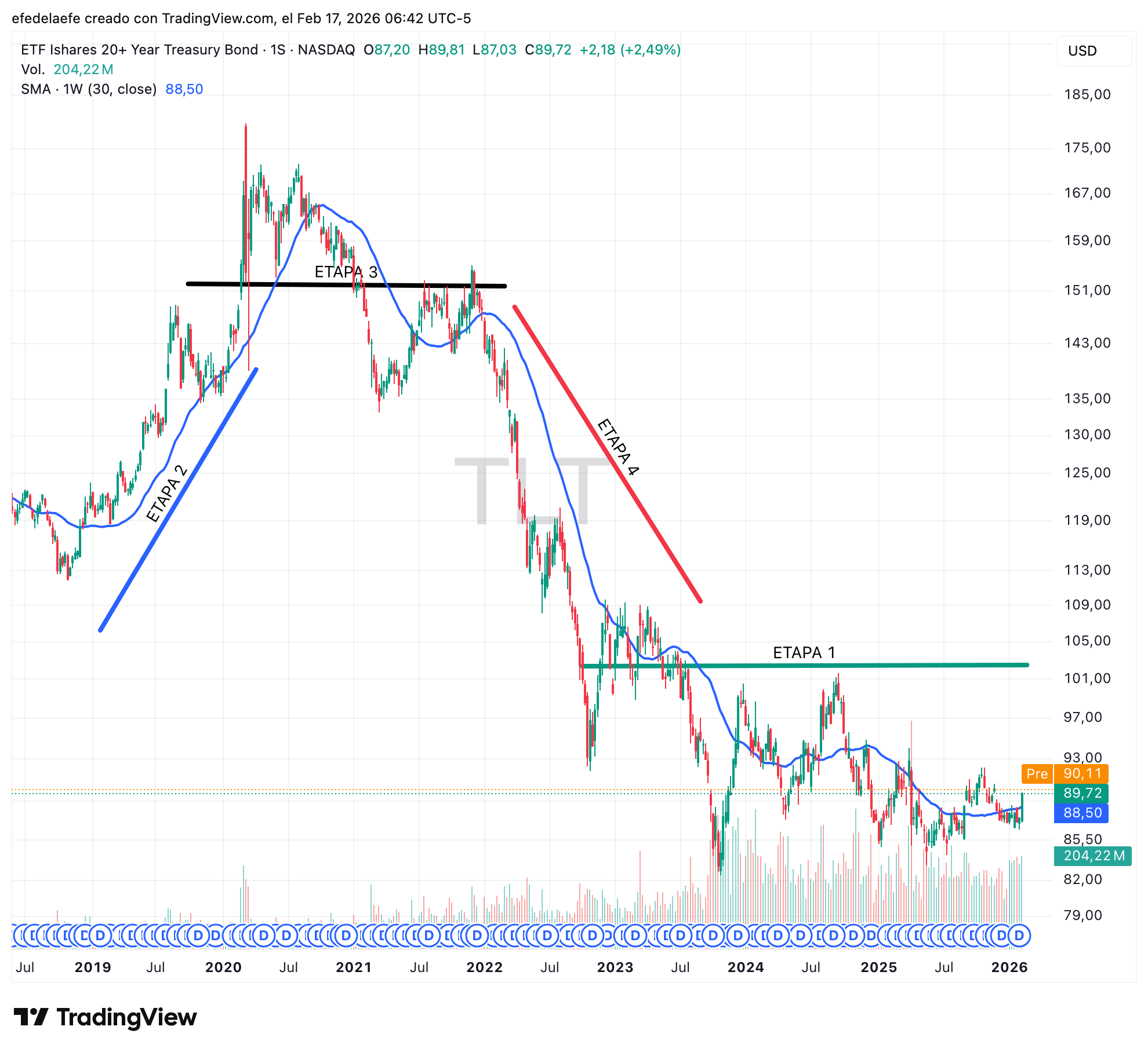 TLT, el ETF de bonos del Tesoro a largo plazo, ofrece un recorrido completo por todas las etapas. En un solo gráfico podemos ver: