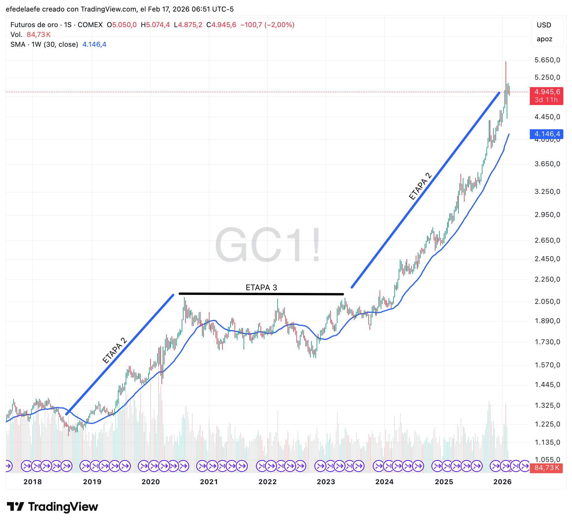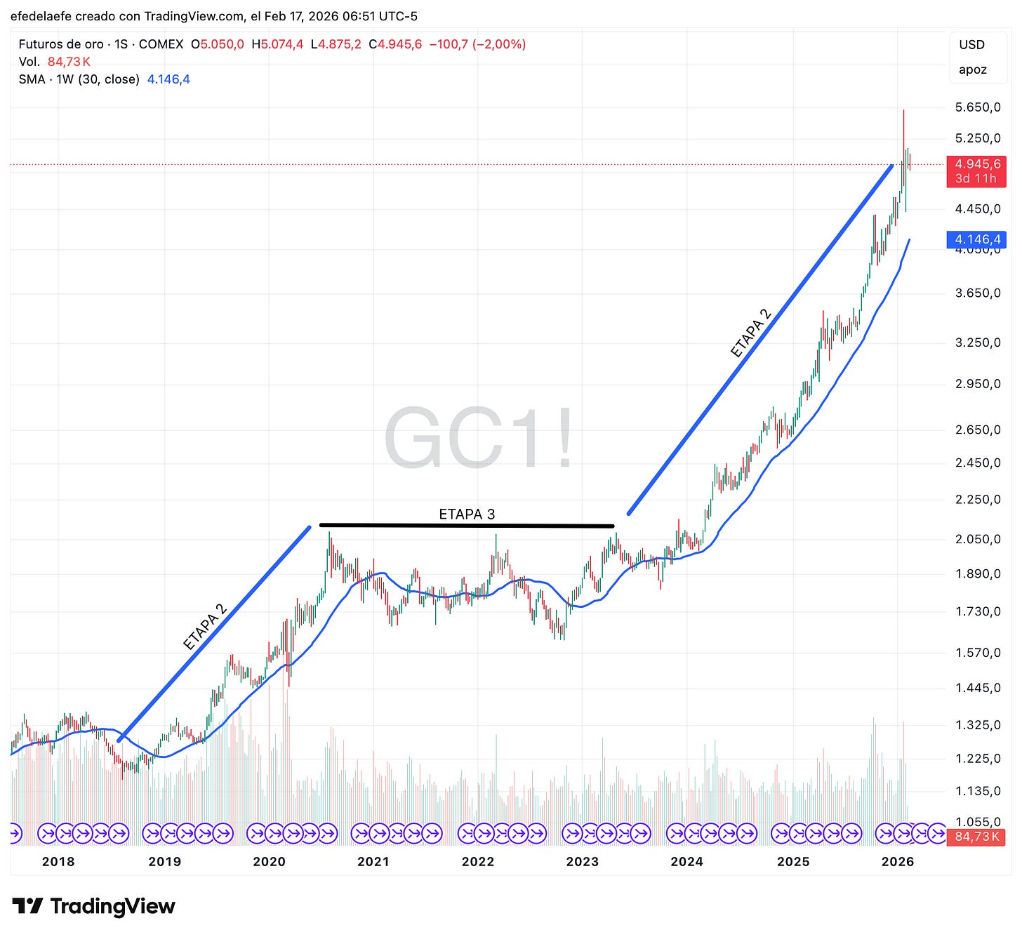 Mucha gente asume que el ciclo siempre es lineal: 1→2→3→4→1. Pero el oro demuestra que una Etapa 3 puede resolverse con una nueva Etapa 2 en lugar de colapsar a Etapa 4.