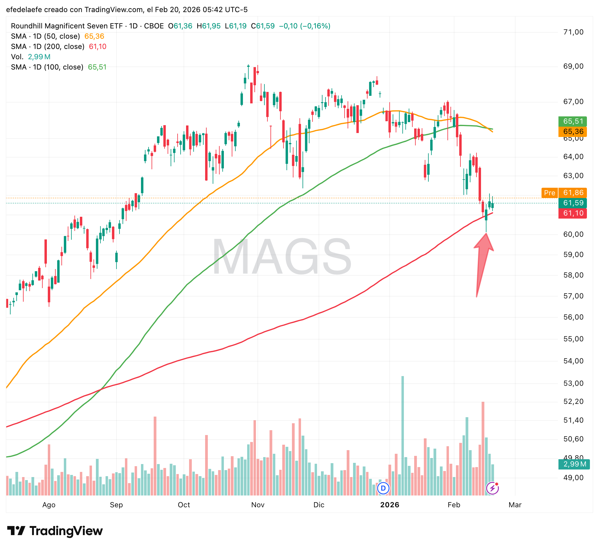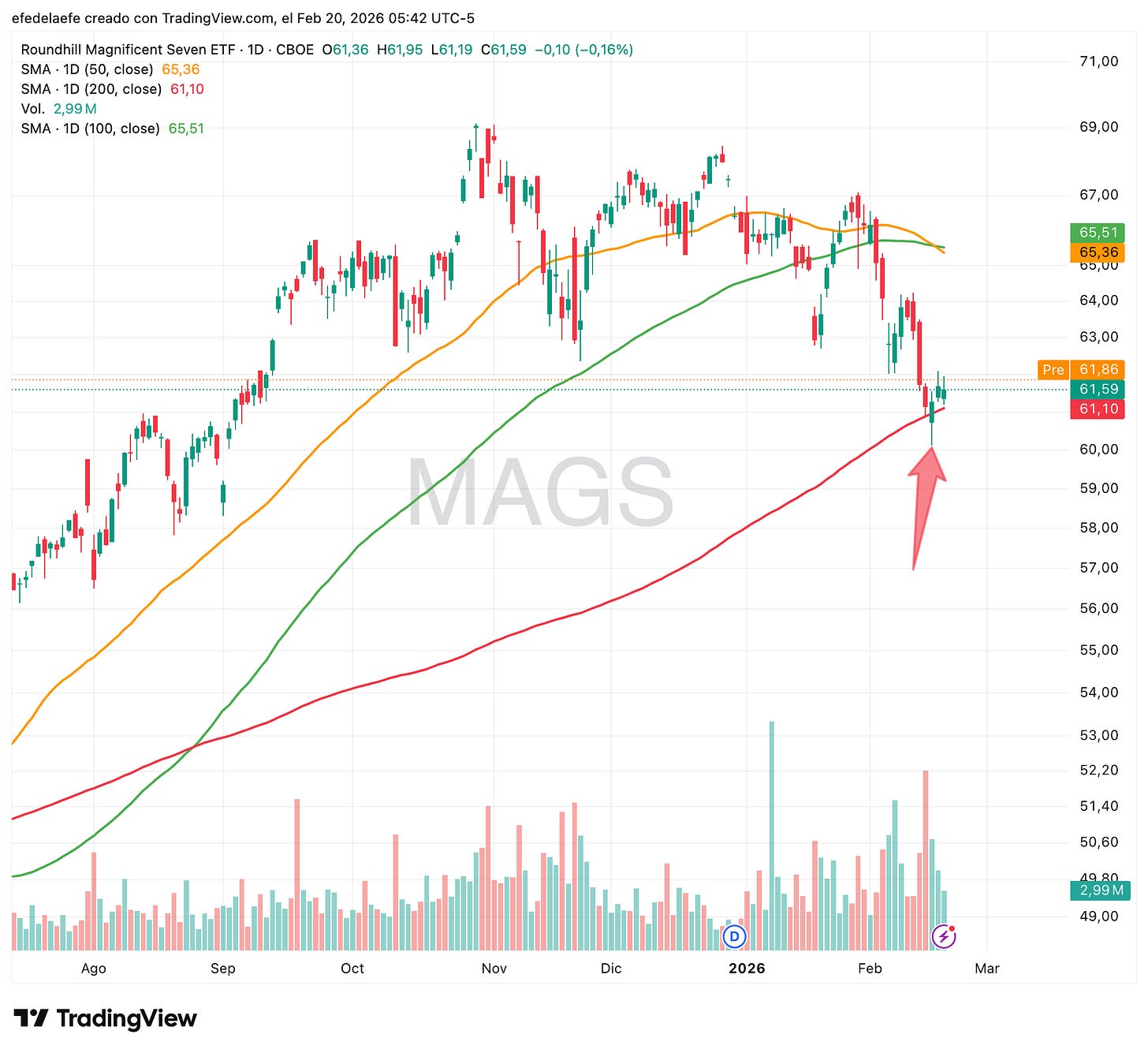 Las Magnificent Seven, agrupadas en el ETF MAGS, nos dan quizás el chart más relevante del momento: el precio ha caÃdo con fuerza desde máximos y ha llegado exactamente a la media de 200 sesiones. Ahà está ahora mismo.