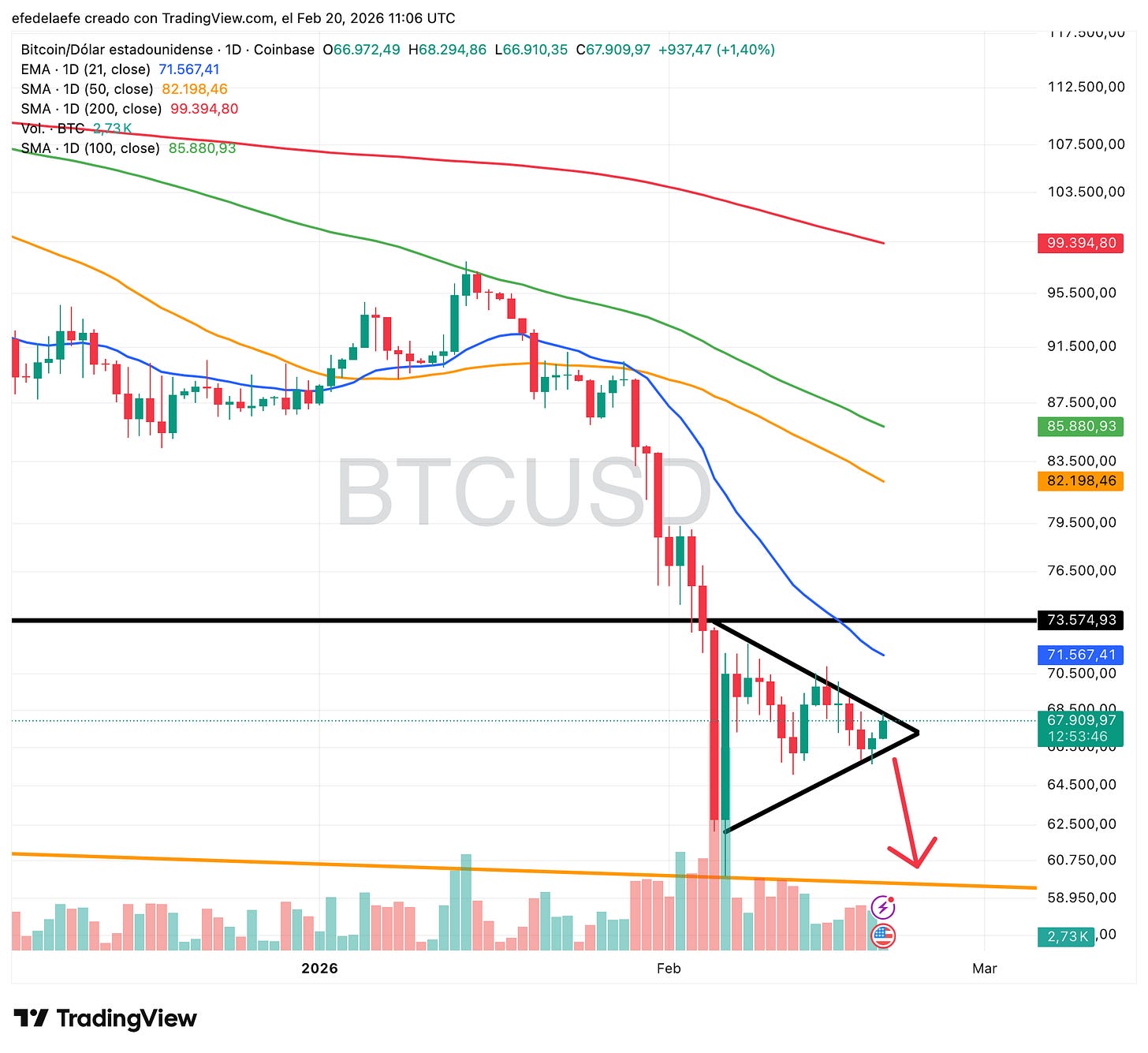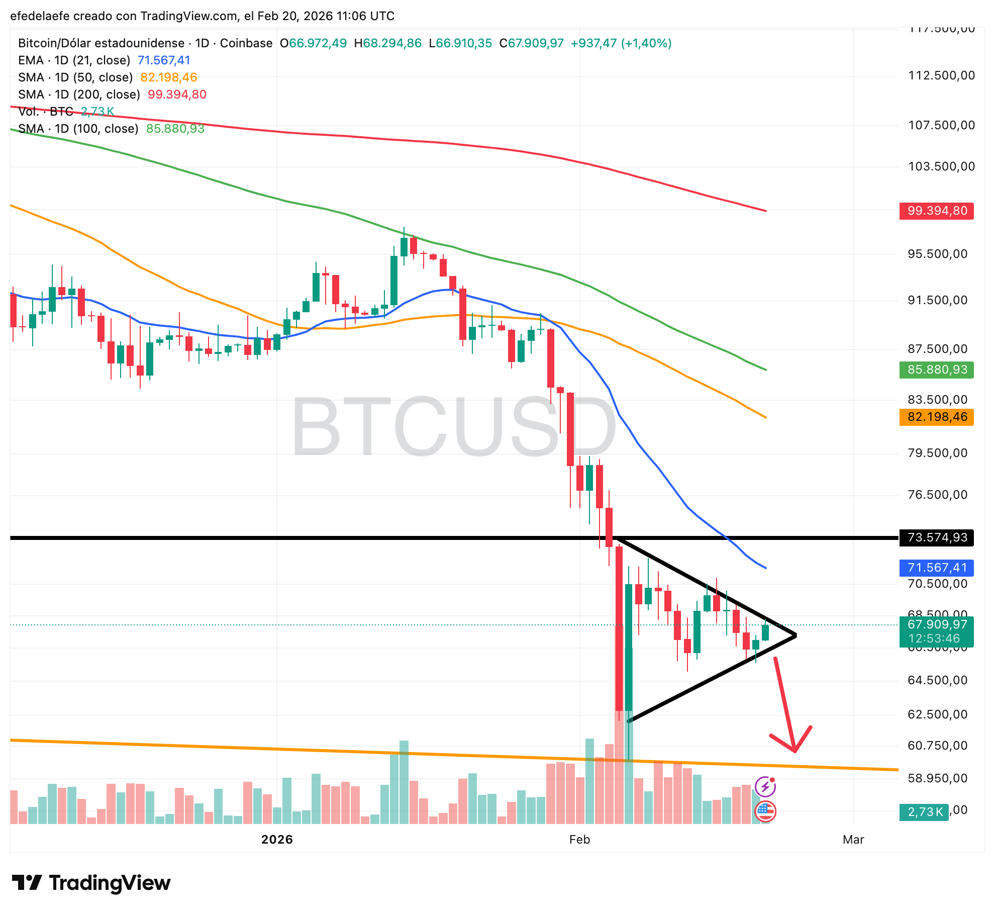 Aquà las medias están todas giradas hacia abajo, el precio lleva semanas por debajo de ellas, y eso le da un sesgo claramente bajista a la figura. Lo más probable, si el banderÃn rompe como indica el entorno, es una visita a la zona de los 60.000 dólares de nuevo.