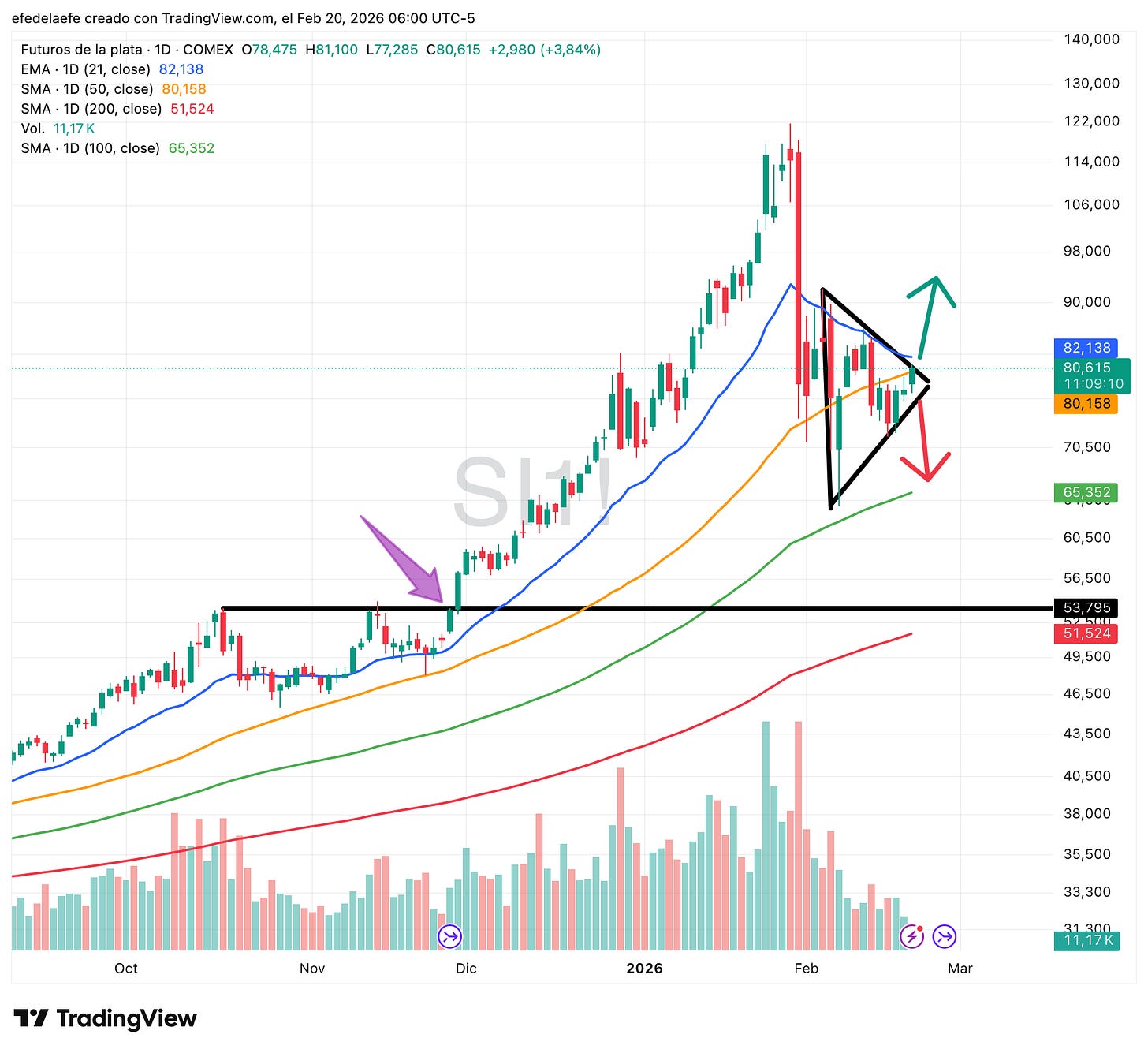 La plata nos deja una figura técnica interesante. Tras la subida vertical de enero el precio lleva semanas consolidando en una estructura triangular convergente con volumen decreciente.