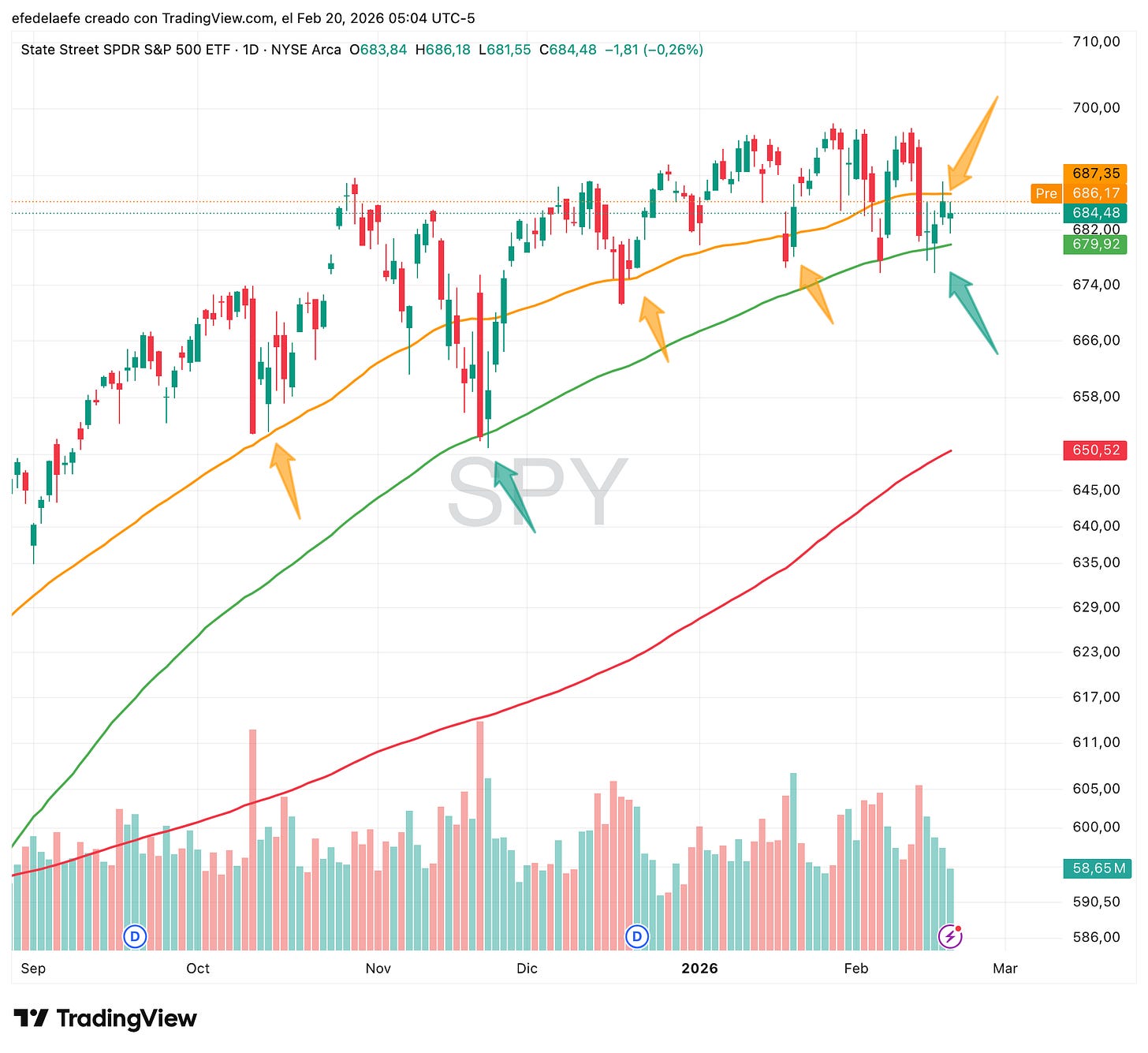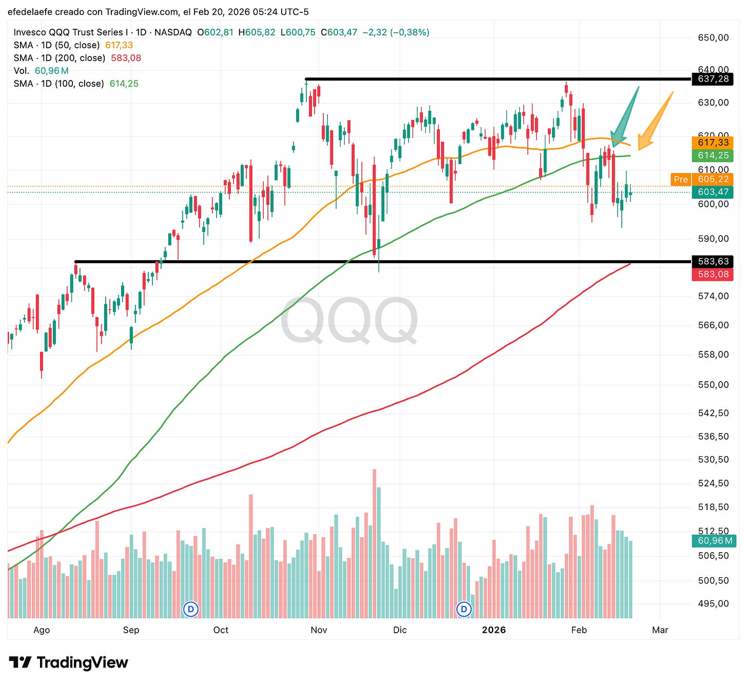 Nasdaq (QQQ) nos da más claridad: el precio lleva meses moviéndose en un rango con un doble techo bastante definido en la zona de 637, y un soporte inferior alrededor de 583 que además coincide prácticamente con la media de 200.