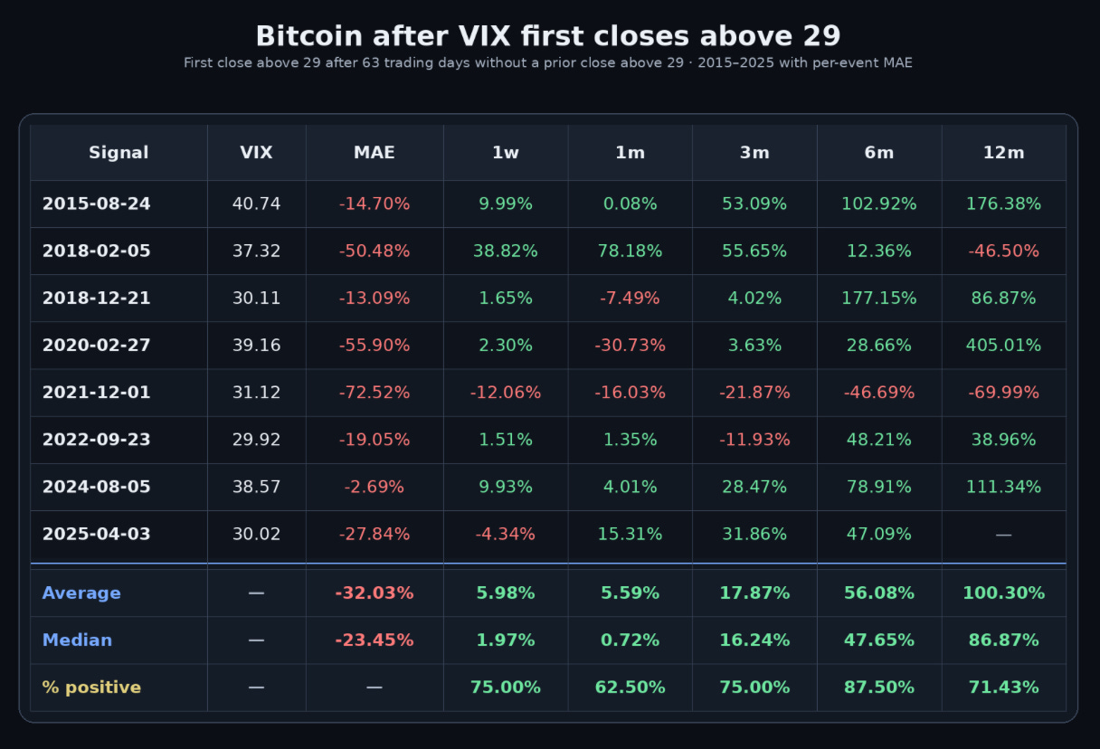 De nuevo, igual que hemos visto antes con el S&P 500, quien compró Bitcoin en el momento de pánico máximo del VIX y aguantó el drawdown que vino después, acabó muy bien recompensado.