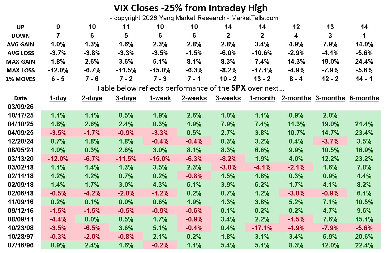 El Índice de Volatilidad nos dio ayer buenas señales. Cuando el VIX marca un pico de pánico intradía y luego cierra con una caída del 25% o más desde ese máximo, los datos históricos apuntan en una dirección bastante consistente.