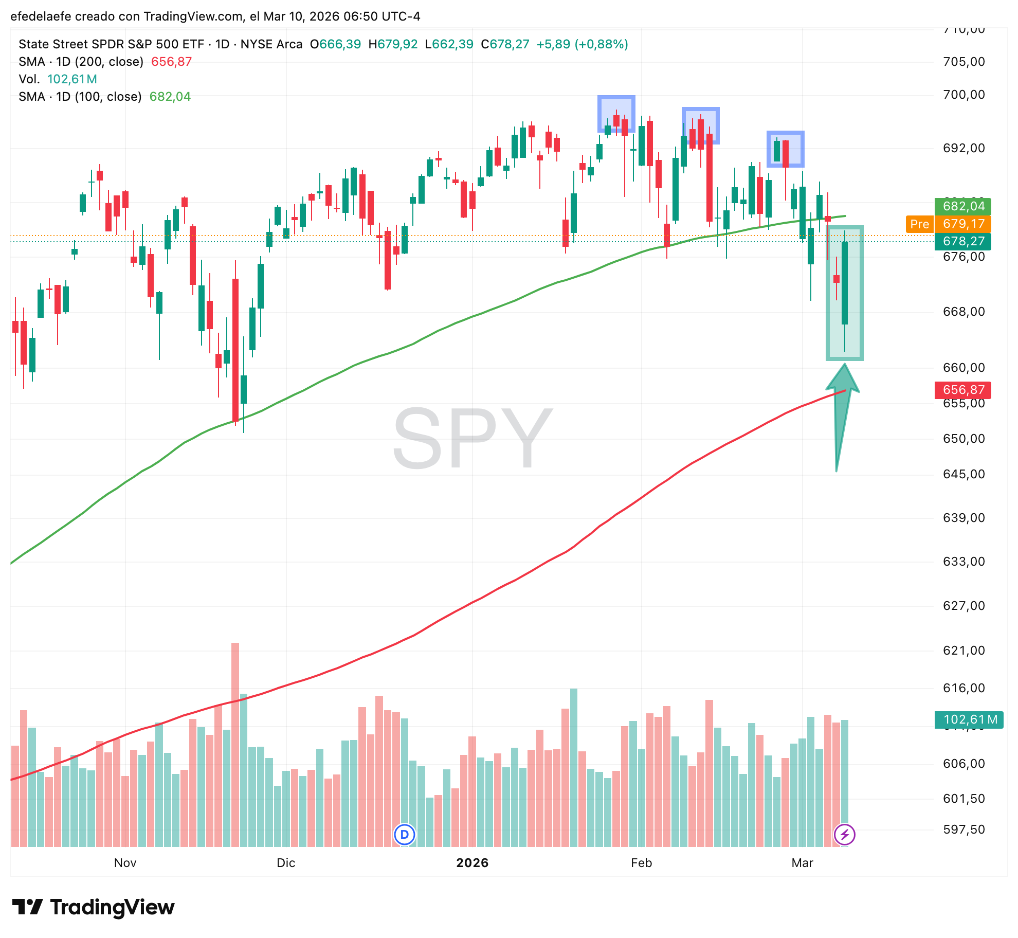 La estructura es bajista: por debajo de la media de 100 días (verde) y tres máximos decrecientes marcados. El mercado lleva semanas sin poder hacer un nuevo máximo, cada rebote se queda más corto que el anterior (cuadrados azules). 🔴