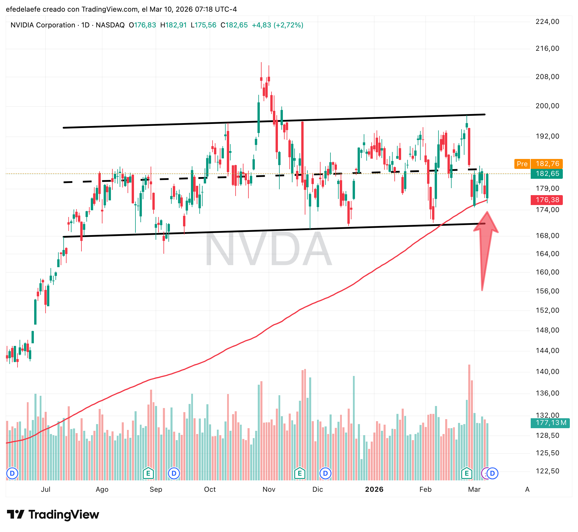 Nvidia mantiene la media de 200 días de momento sin problemas. La estructura sigue siendo un canal horizontal entre 168 y 196 aproximadamente. Ni tendencia clara arriba ni ruptura bajista. Mientras la media de 200 aguante, el escenario base es continuación del rango. La resistencia relevante a vigilar está en la zona 192-196, techo del canal. 🟢