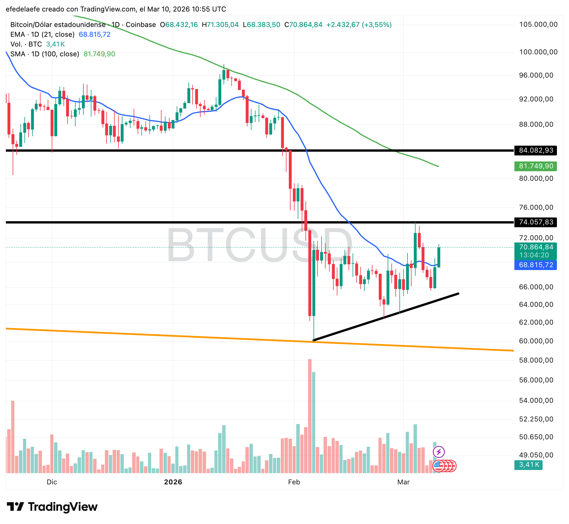 Buena estructura. No sólo no le ha afectado la situación de Irán, sino que todo lo contrario, se ha sostenido y ha recuperado la media de 21 días (azul). Parece dispuesto a atacar la primera resistencia de $74.000 con objetivos: media de 100 días y $84.000. 🟢
