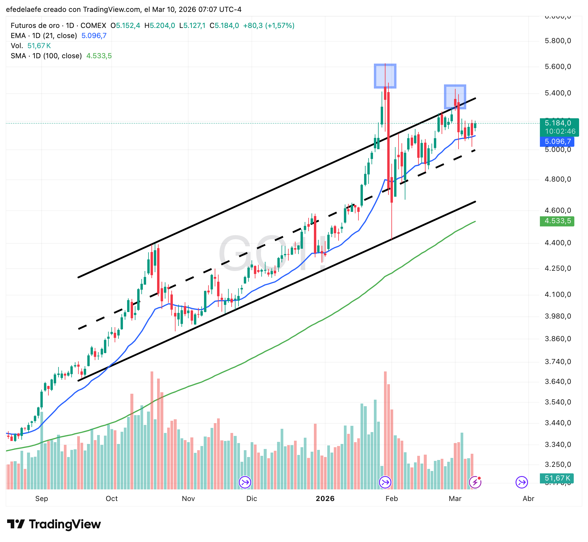 Sigue dentro del canal, ha vuelto a apoyarse en la media de 21 días (azul) que pasa a ser un claro stop. La estructura se ha complicado un poco porque el máximo reciente es mas bajo que el de enero (cuadrados azules) pero tras ambos rechazos el precio no se derrumba, simplemente consolida dentro del canal. La tendencia no se ha roto. 🟢